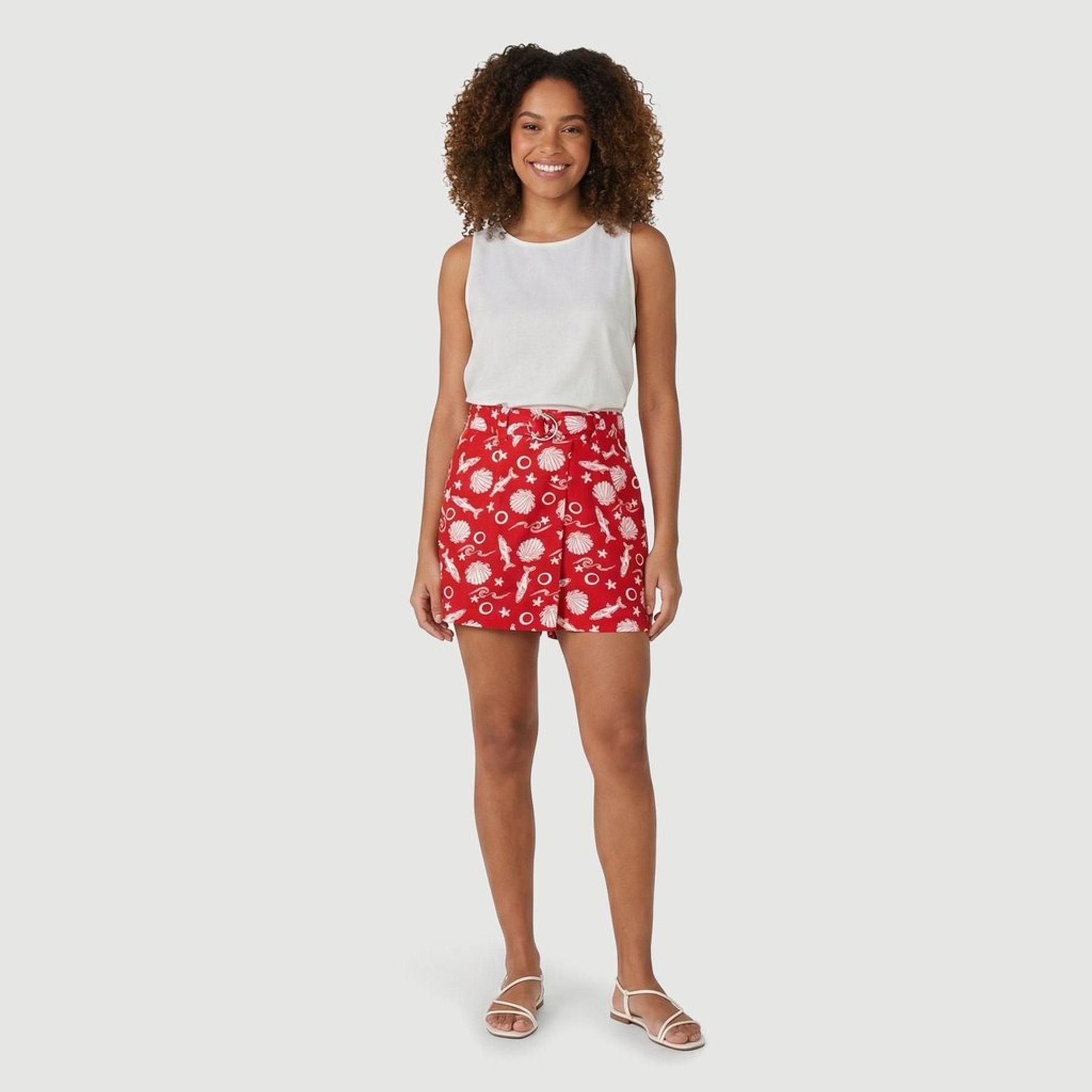 Economia de R$ 12,00A bermuda feminina Viva Casual é ideal para compor produções de verão e passeios. Em vermelho, traz estampa com temática de fundo do mar em branco, com conchas, peixes, estrelas-do-mar e ondas, criando um visual descontraído.