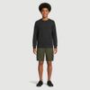 O cós elástico com cordão permite melhor ajuste ao corpo. Conta com bolsos frontais laterais e bolsos cargo com aba e fechamento por botão de pressão, oferecendo mais espaço para itens essenciais. Finaliza com etiqueta/aplique discreto próximo à barra.