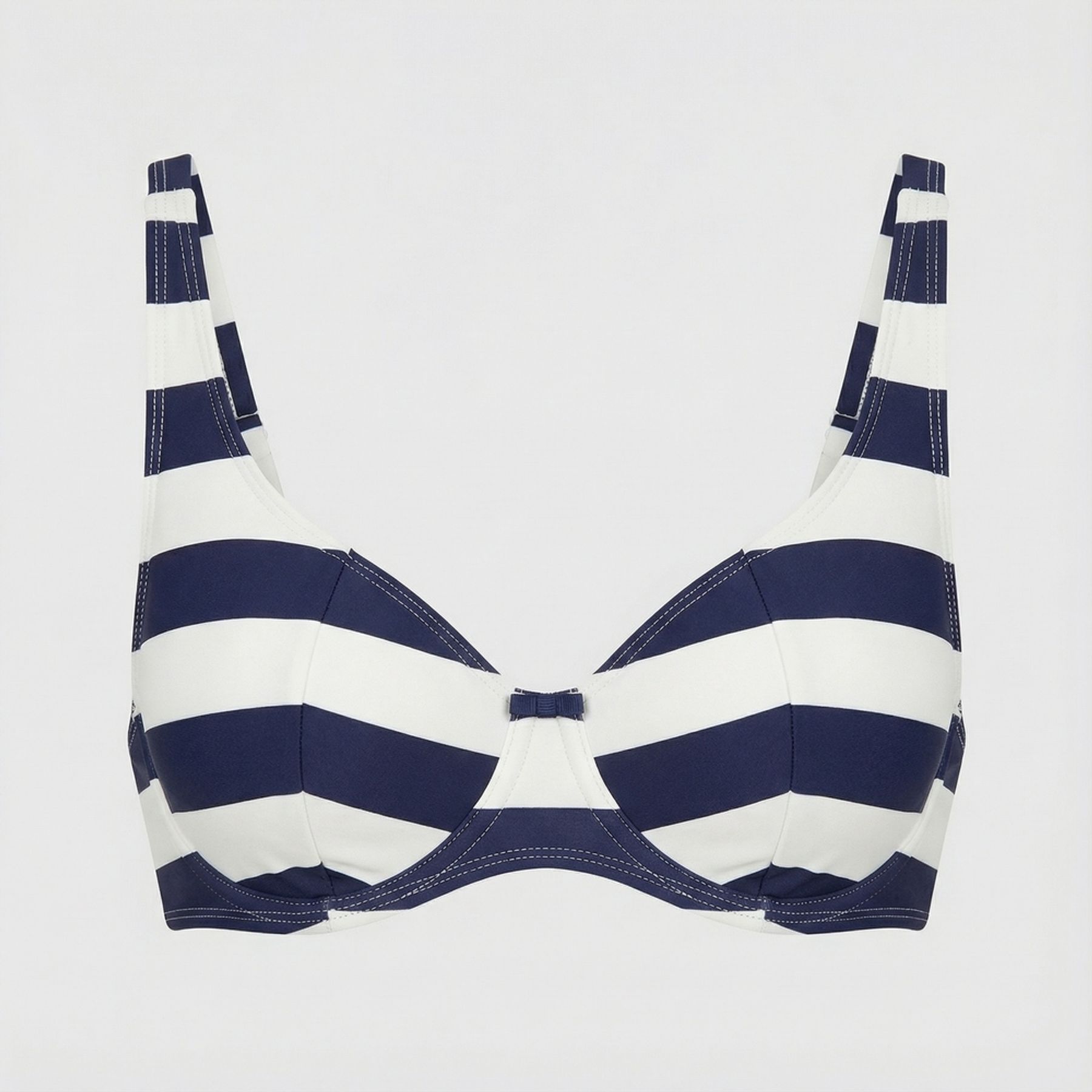 Economia de R$ 34,00O top de Biquíni Co Viva praia traz visual navy com listras largas em azul-marinho e branco. A modelagem estruturada com bojo e aro oferece melhor sustentação, enquanto as alças largas e o decote em V valorizam o caimento. Confeccionado em tecido sintético de toque macio, tem acabamento sem brilho e costuras aparentes que complementam o design.