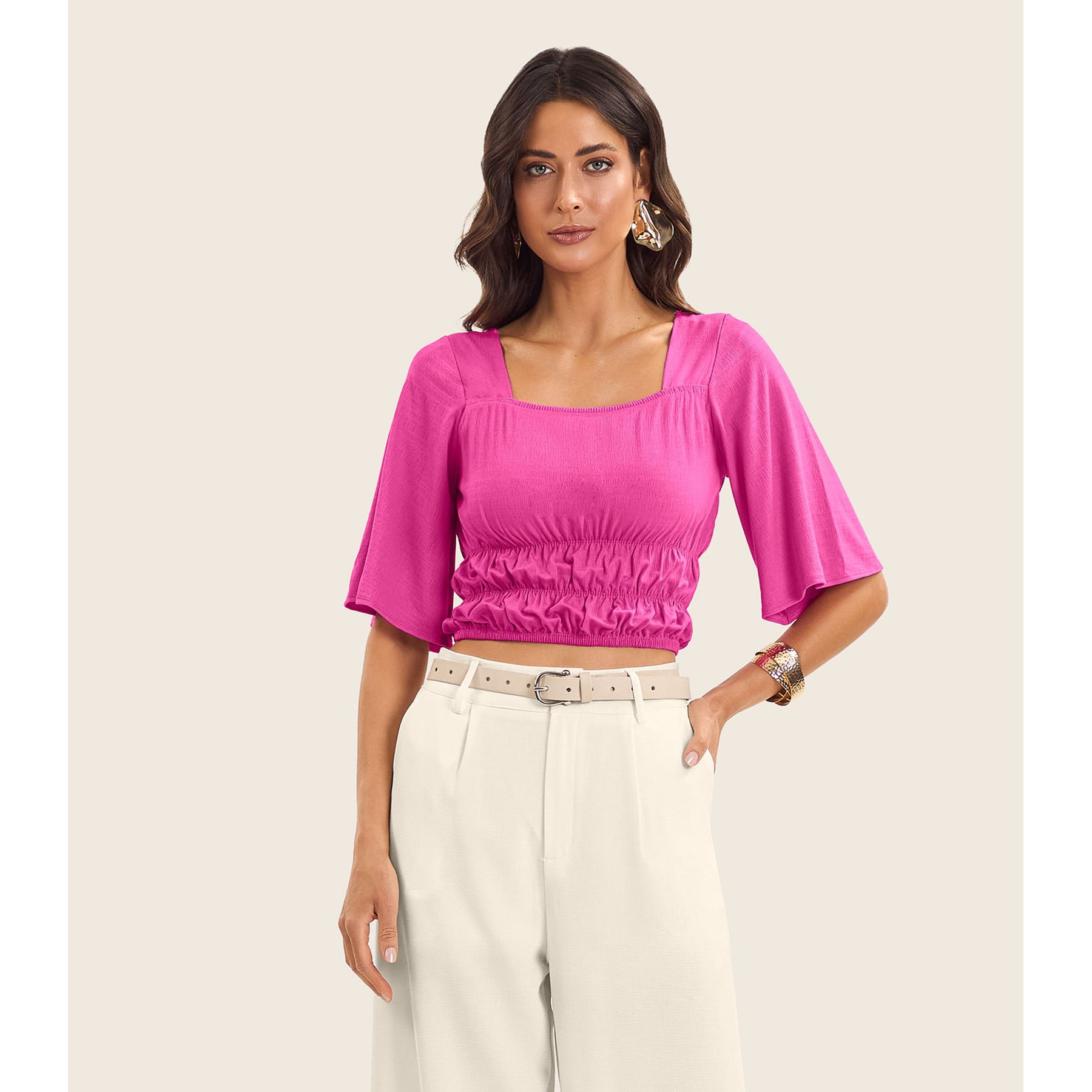 Blusa Bege Feminina Manga Curta Mordidinha Urbano