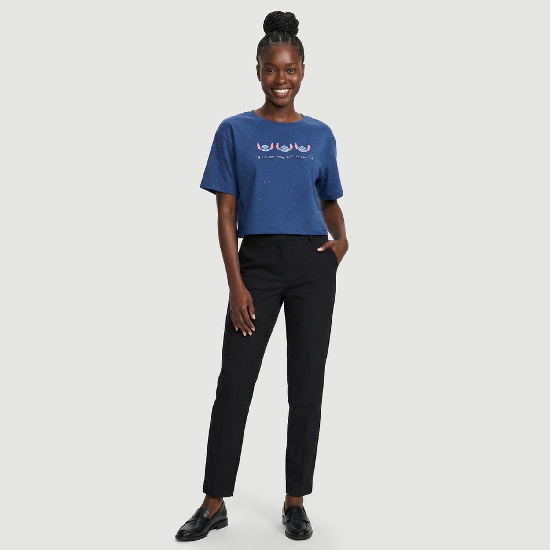 Economia de R$ 25,00A blusa feminina cropped Dpvc Disney é confeccionada em malha 100% algodão, com toque macio e respirável. Em azul, tem gola redonda e mangas curtas, trazendo estampa frontal centralizada do Stitch com frase em branco para um visual jovem e descontraído.