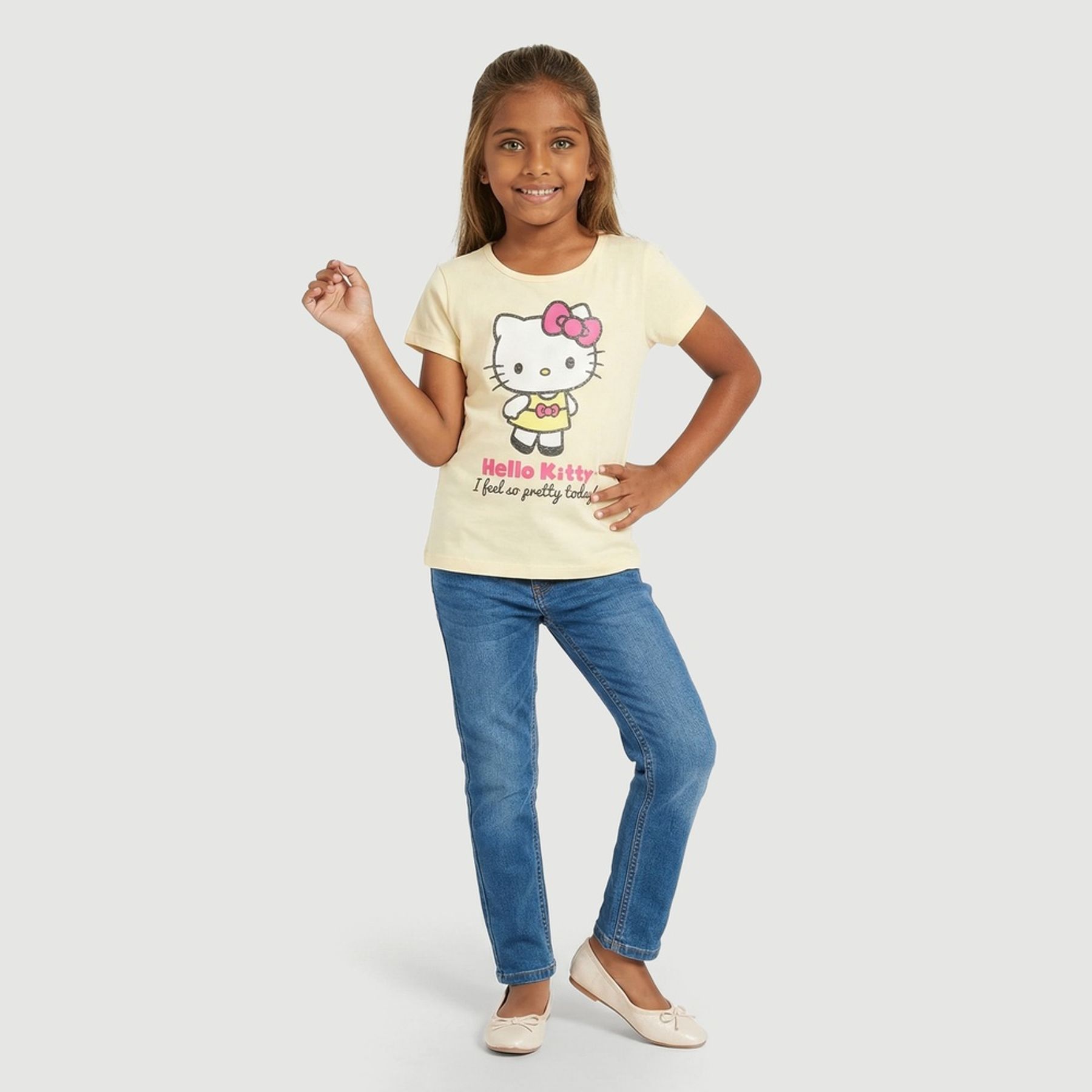 O modelo conta com gola redonda e barra com costura aparente, oferecendo um acabamento simples e prático para o uso diário. Blusa Hello Kitty pensada para facilitar na hora de vestir.