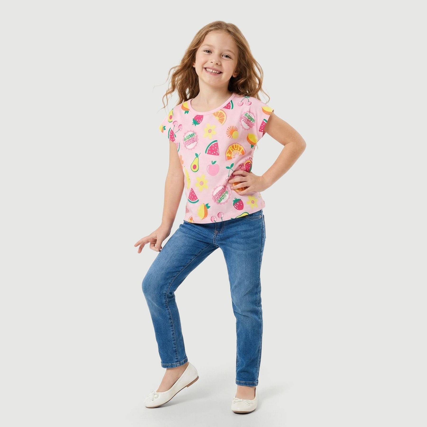 Economia de R$ 2,60Blusa infantil Yeapp confeccionada em malha de algodão, ideal para compor looks leves e divertidos. Possui gola redonda, modelagem reta e estampa total com frutas, flores e frases como “super fresh” e “fruit”, em fundo rosa. Composição: 100% algodão.