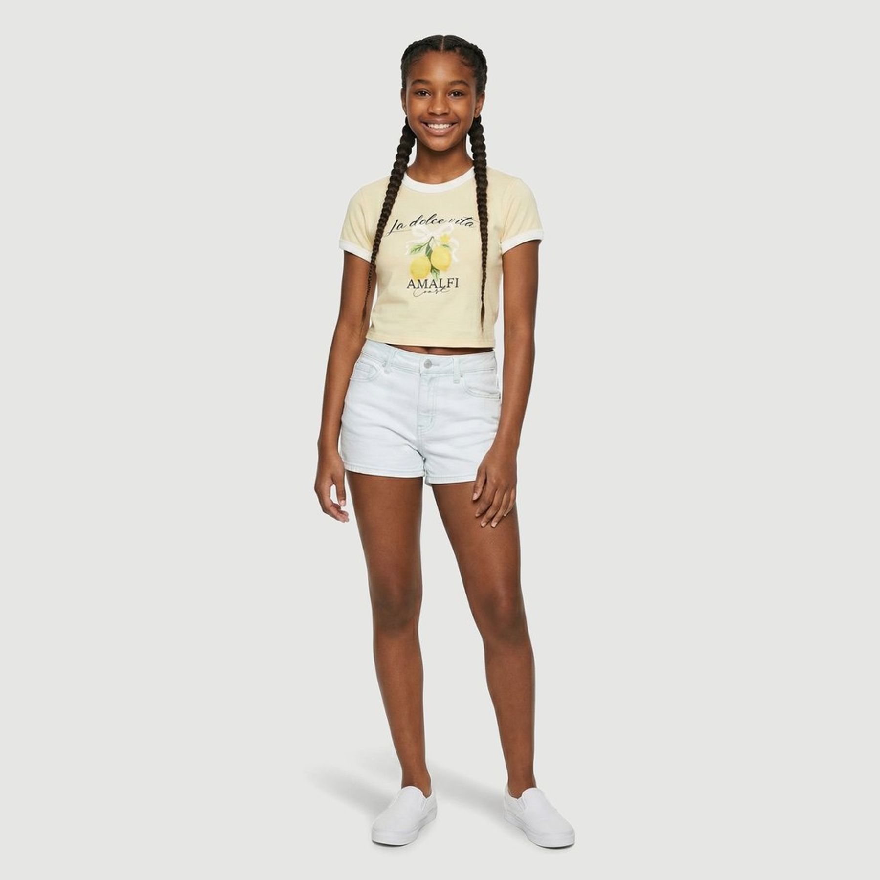 Economia de R$ 4,00Blusa feminina cropped Love Trend em malha 100% algodão, ideal para compor produções atuais. A estampa frontal com as frases “La dolce vita” e “AMALFI coast”, acompanhada de ilustração de limões e flor, traz inspiração no tema Amalfi/italiano.