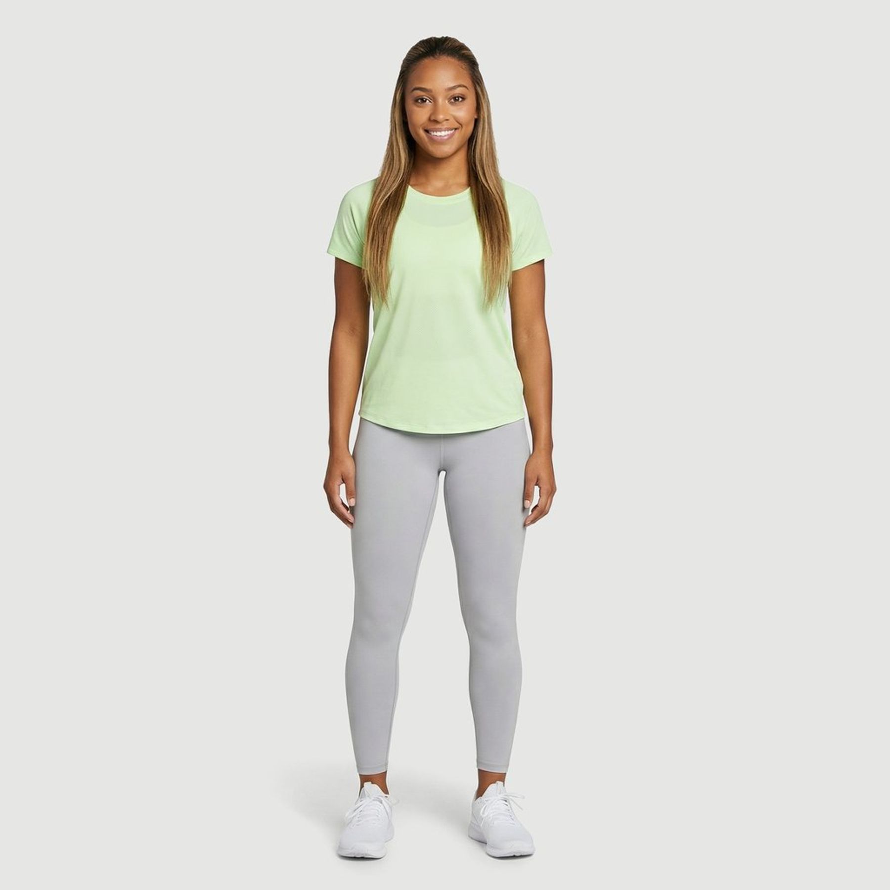 Com modelagem reta, gola redonda e manga curta, a peça lisa em verde claro combina facilmente com jeans, saias ou shorts, sendo ideal para um visual minimalista e atemporal.