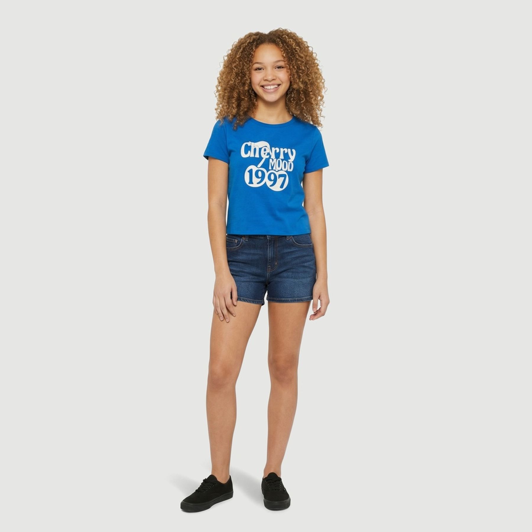 A estampa frontal centralizada em branco com a frase “Cherry Mood 1997” adiciona um toque jovem ao visual, ideal para usar com jeans, shorts ou saias em produções leves e versáteis.