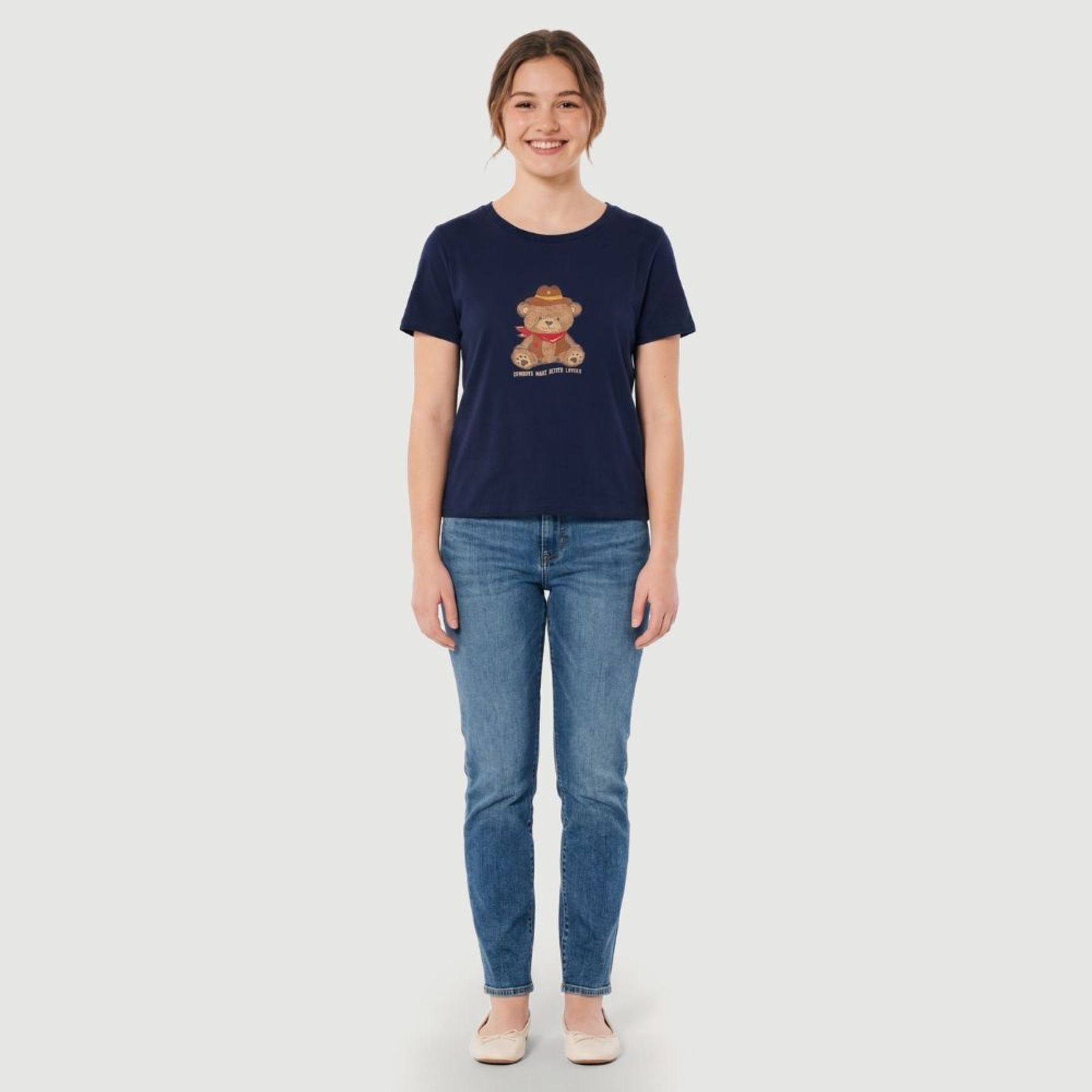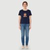 A estampa frontal centralizada de ursinho cowboy com frase em inglês dá um ar divertido à peça. Na cor azul marinho, combina facilmente com jeans, shorts e tênis para produções práticas.