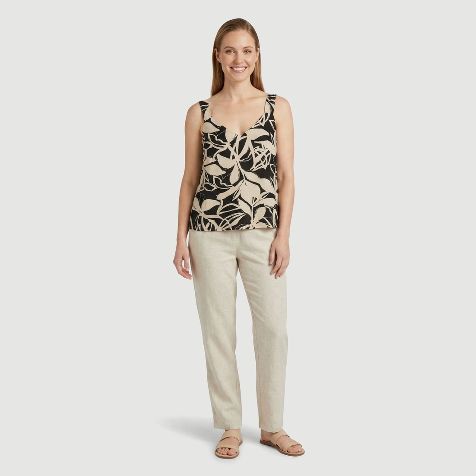 O destaque fica por conta da estampa de folhagens em contraste, com decote em V e alças largas que valorizam o acabamento. A barra simples finaliza o visual com praticidade.