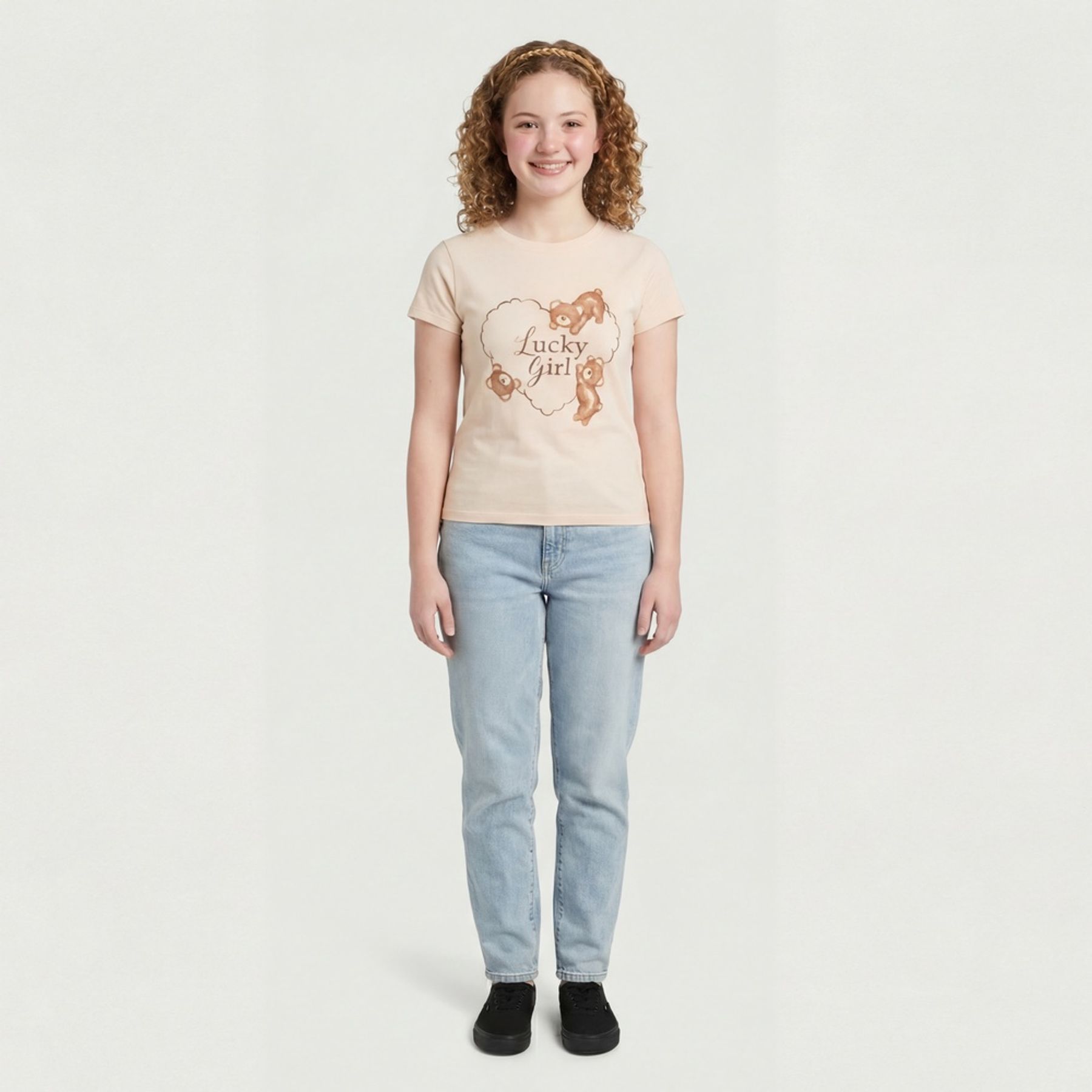 O destaque fica por conta da estampa frontal centralizada com a frase “Lucky Girl”, coração contornado e três ursinhos em marrom, criando um visual delicado. Na cor bege, combina facilmente com jeans, shorts e saias. Itens inclusos: 01 blusa.