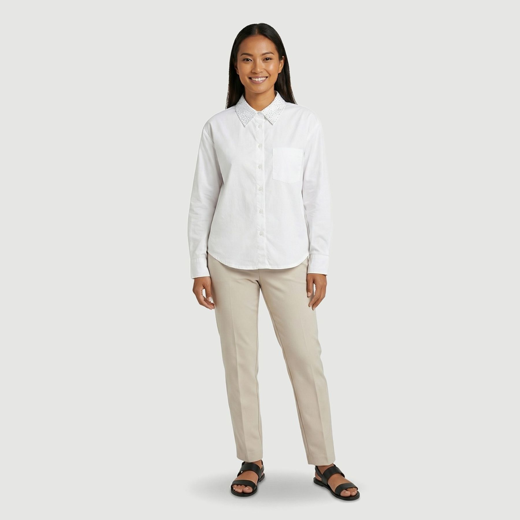 O modelo conta com gola colarinho, punhos com botões, pala nas costas e barra arredondada, oferecendo um caimento alinhado e versátil para diferentes ocasiões. Uma opção prática para o trabalho e para produções cotidianas com toque elegante.
