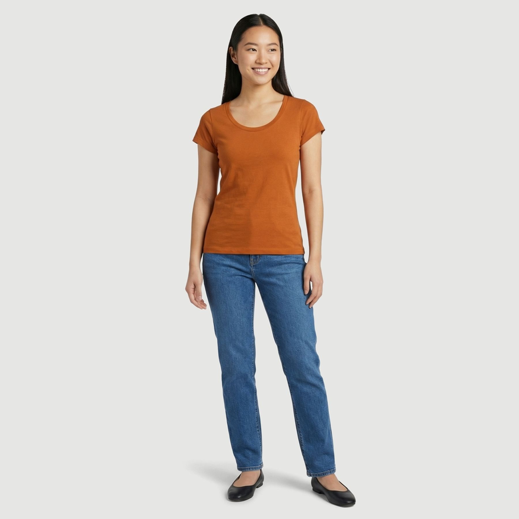 Em tom caramelo e visual liso, conta com manga curta, gola redonda mais aberta e modelagem ajustada, valorizando o caimento. O acabamento com barra simples e costuras aparentes nos ombros e mangas adiciona um detalhe discreto ao design.