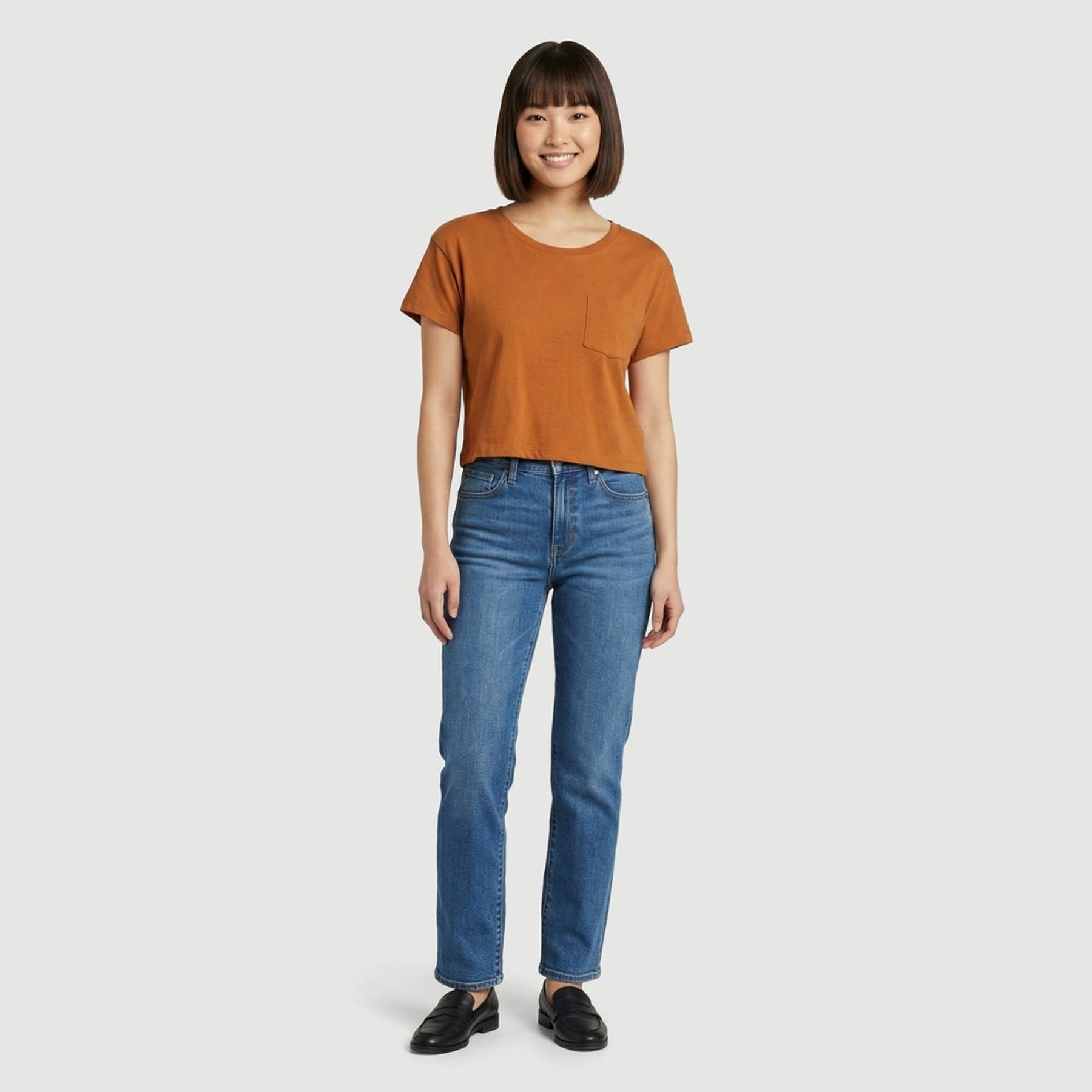 O modelo liso na cor caramelo conta com manga curta, gola redonda e bolso frontal no peito. A modelagem cropped com barra reta adiciona um visual moderno ao básico.