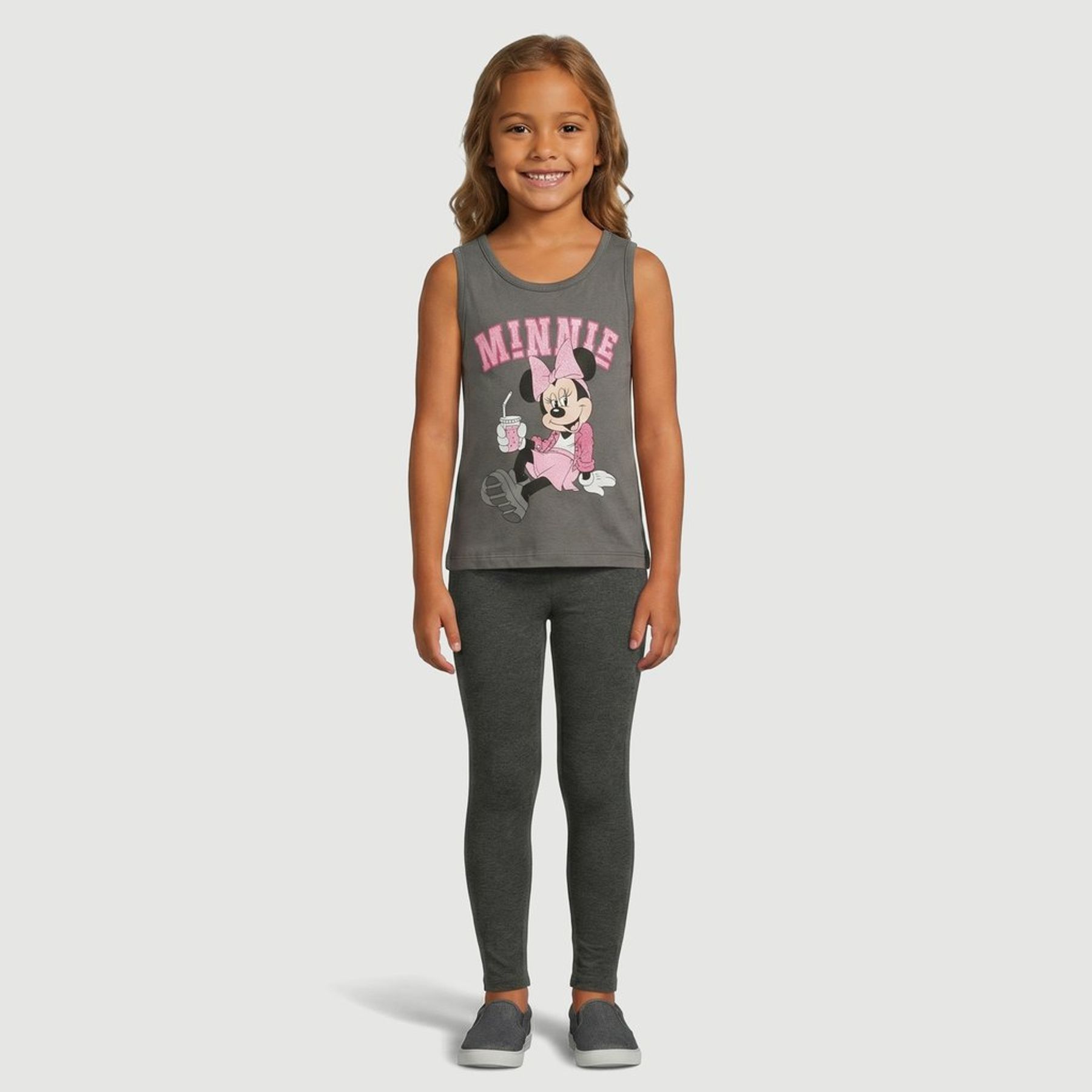 A estampa frontal centralizada traz a Minnie Mouse sentada com a escrita “MINNIE” em destaque, em detalhes rosa sobre o fundo chumbo. O modelo sem mangas e a gola redonda deixam a peça prática para combinar com shorts, saias e calças, criando produções descontraídas com personagem licenciado Disney.