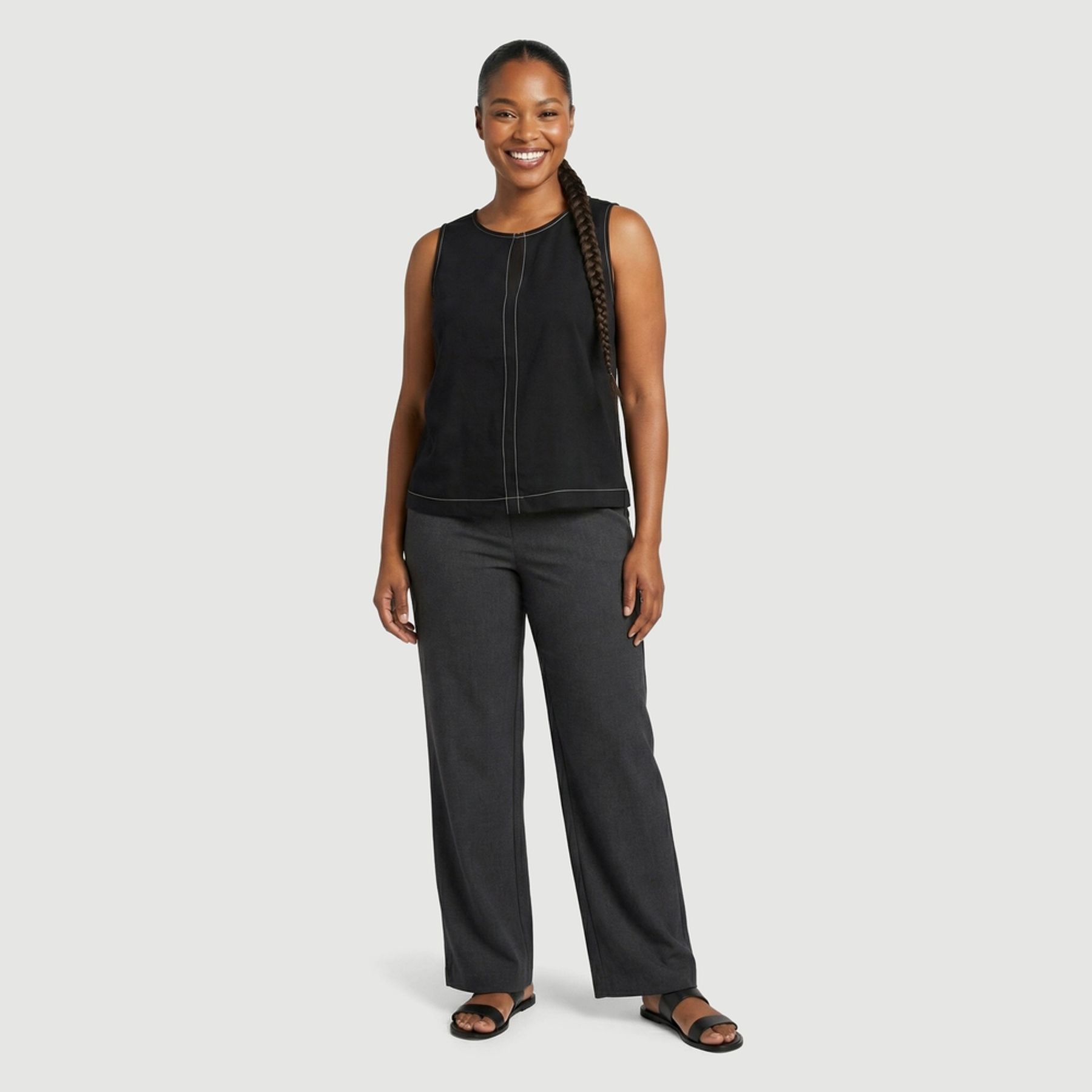 Economia de R$ 7,00A blusa feminina Urbano sem manga é feita em 100% viscose, com toque suave e caimento soltinho. Em preto liso, traz pespontos contrastantes aparentes que destacam a costura central e o recorte/pence frontal, criando um visual minimalista e atual.