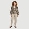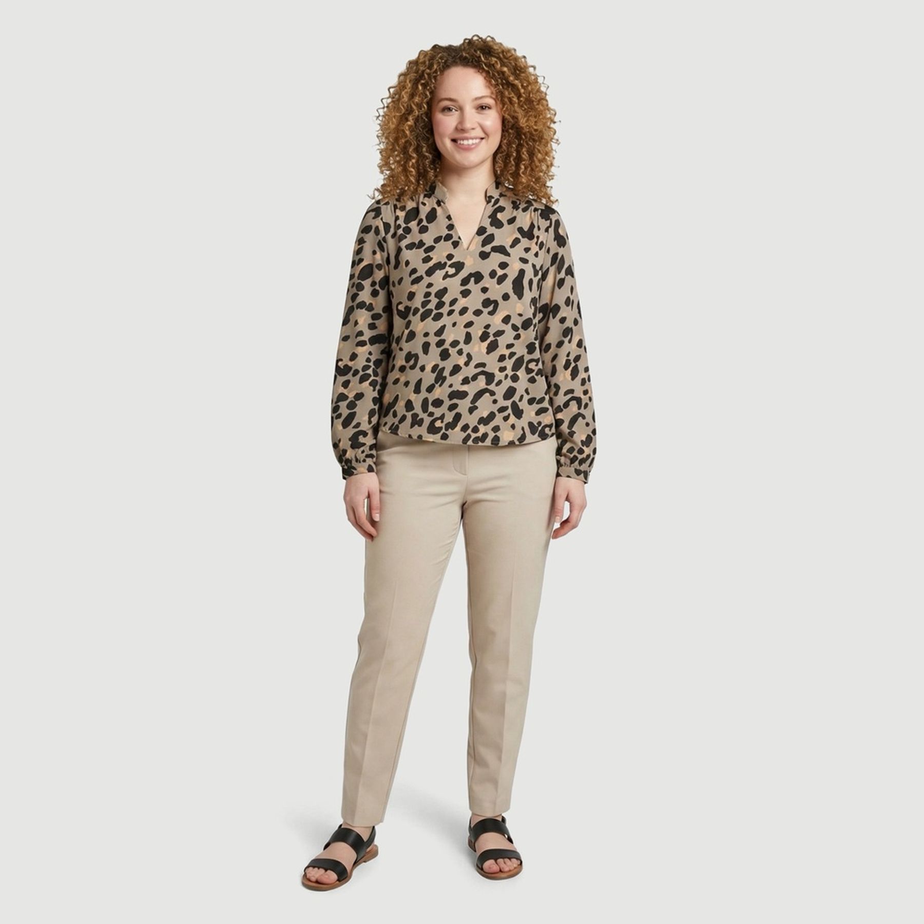 A estampa tipo onça em tons de bege com detalhes pretos traz personalidade. A gola padre e a abertura frontal com botões deixam o look mais alinhado, enquanto os punhos com elástico e o franzido no ombro acrescentam um acabamento delicado.
