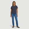 A estampa de listras finas em azul marinho com branco traz um visual clássico e fácil de combinar. Possui manga curta, decote V, modelagem reta e barra simples, ideal para usar com jeans, saias ou shorts.