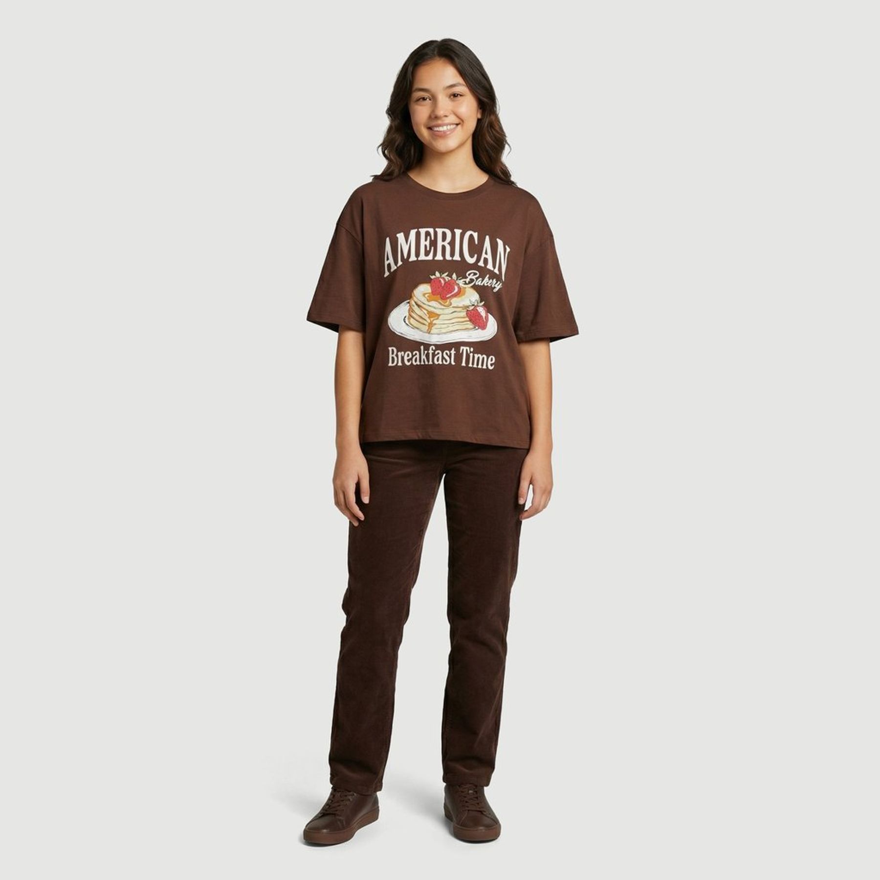 Economia de R$ 11,30A camiseta feminina oversized Love Trend é confeccionada em malha 100% algodão e traz toque macio para o uso diário. Na cor marrom, possui estampa frontal centralizada com frases em inglês e ilustração de panquecas com morangos, em tema de café da manhã.