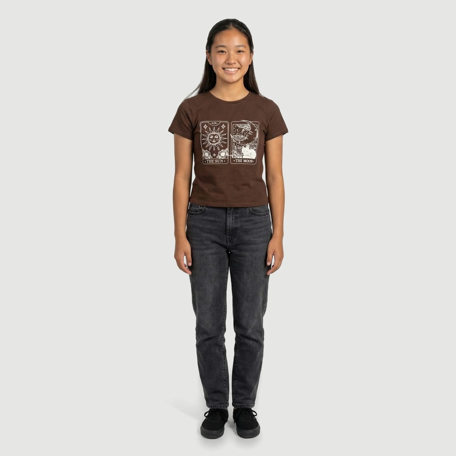 Economia de R$ 3,00Blusa feminina Love Trend confeccionada em malha 100% algodão, com toque macio e boa respirabilidade. Possui modelagem reta, gola redonda e manga curta. A estampa frontal centralizada inspirada em cartas de tarot com sol e lua cria um visual moderno e cheio de personalidade. Conteúdo da embalagem: 01 blusa.