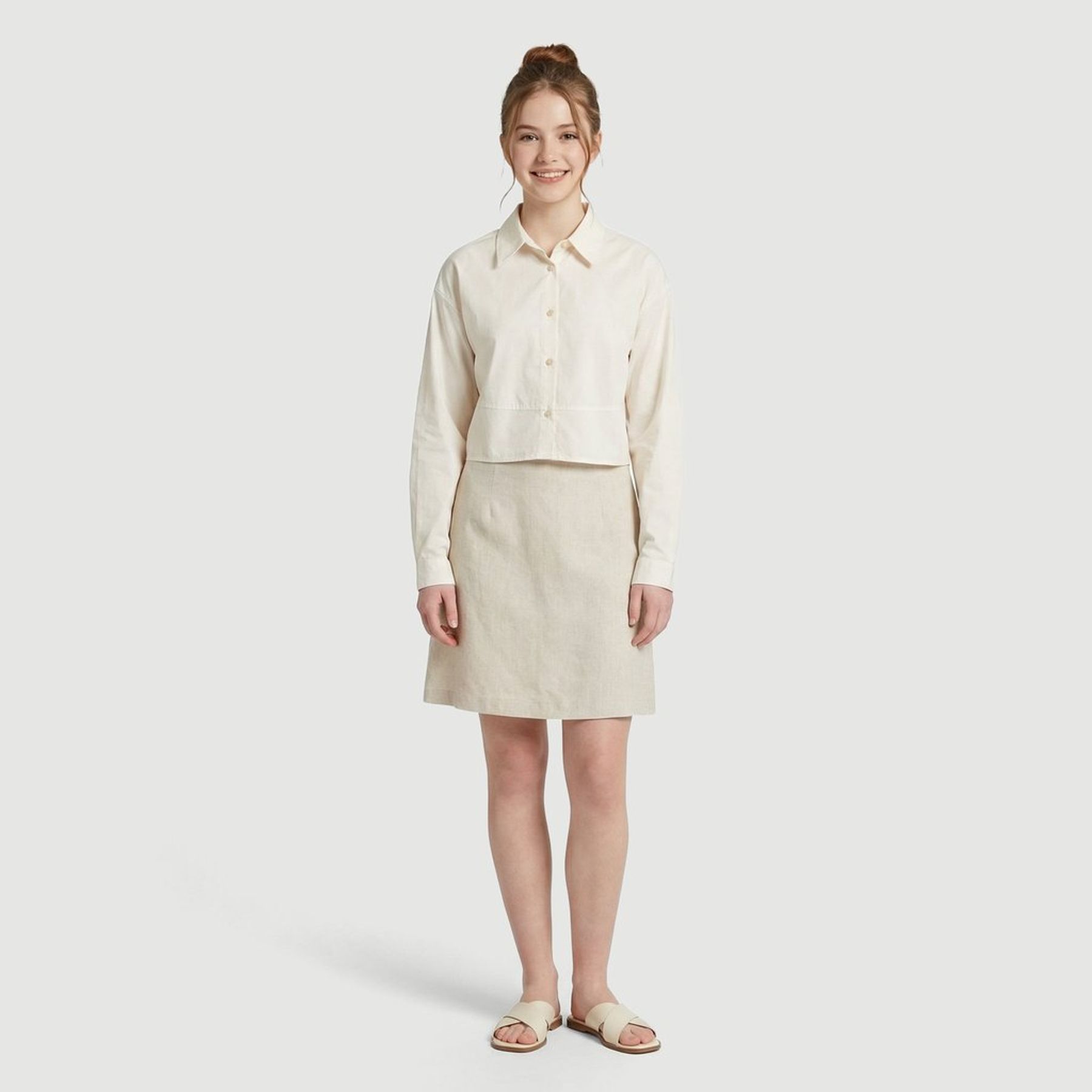 Em cor bege e acabamento liso, conta com gola estruturada, fechamento frontal por botões e mangas longas. O recorte na barra destaca a modelagem cropped e traz um ar moderno, combinando bem com jeans, alfaiataria e saias.