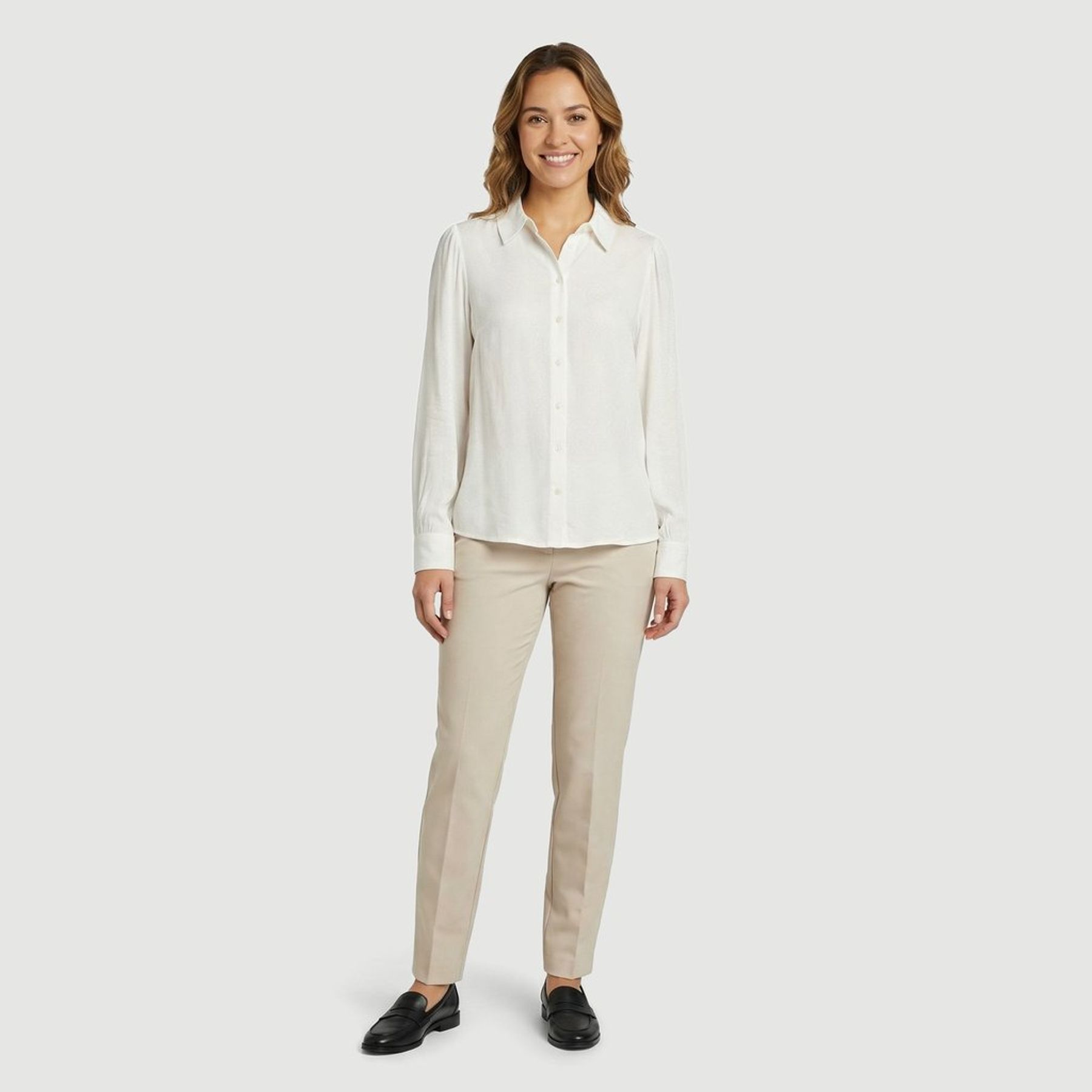 O modelo conta com gola clássica de camisa, fechamento frontal por botões, punhos com abotoamento e leve franzido nos ombros, trazendo um acabamento alinhado para diferentes ocasiões. Na cor creme, combina facilmente com calças de alfaiataria, jeans e saias, funcionando bem para o trabalho e eventos que pedem um visual mais arrumado.