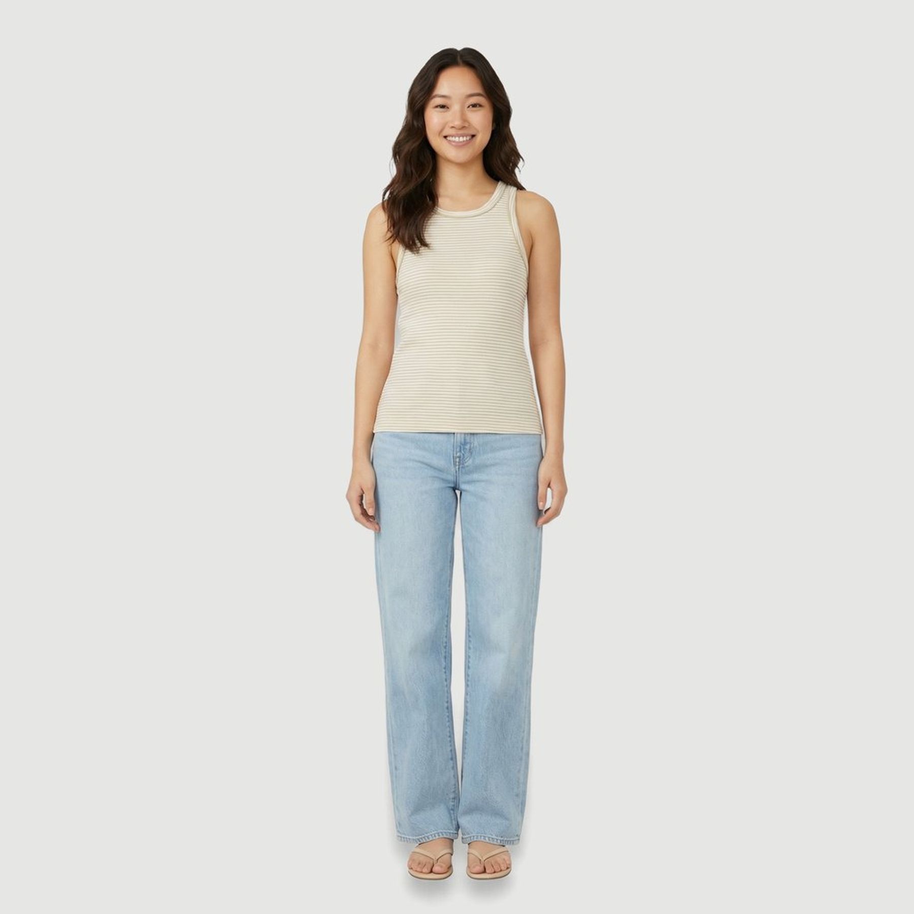 O visual traz listras horizontais finas em dourado sobre fundo creme, com leve brilho do lurex. Possui gola redonda, cavas amplas, modelagem sem mangas e barra simples, combinando facilmente com jeans, saias e shorts.