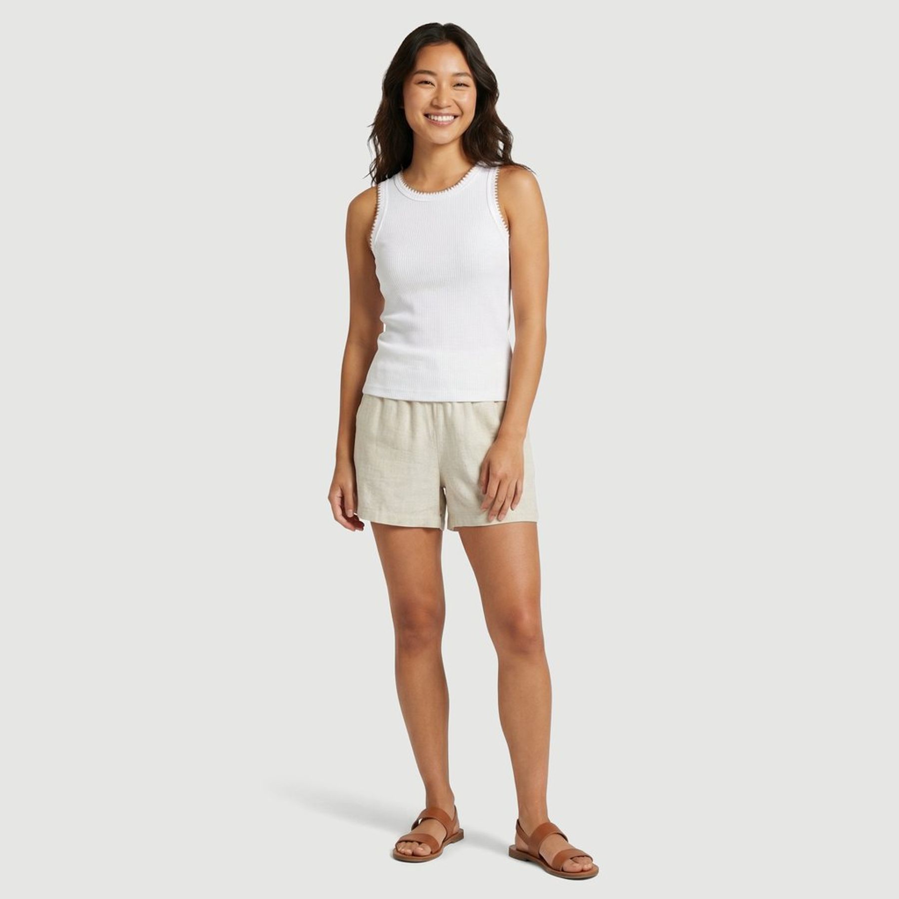 O acabamento contrastante tipo crochê/linha na gola redonda e nas cavas amplas estilo regata adiciona um detalhe delicado ao básico, facilitando combinações com jeans, saias e shorts.
