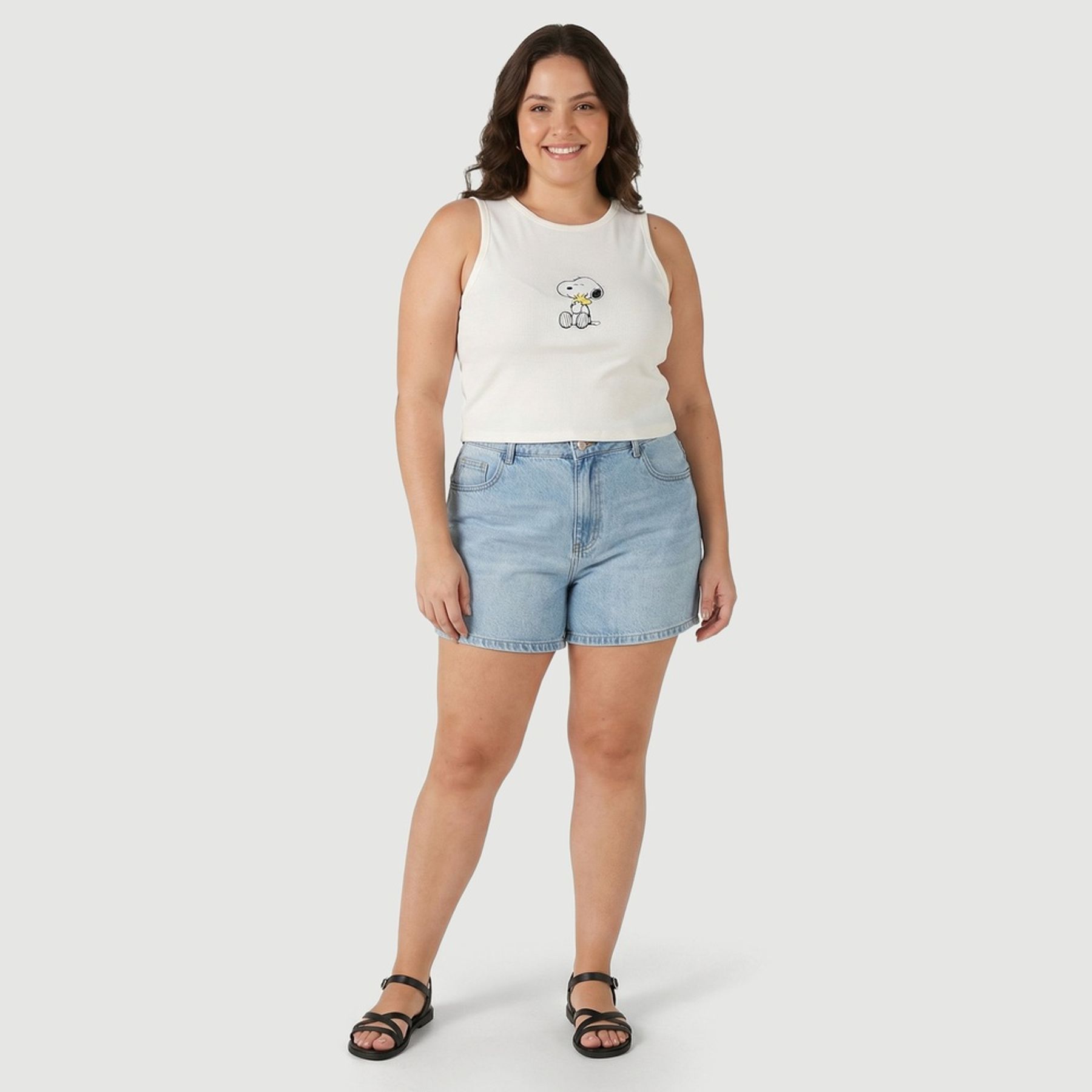O modelo sem mangas possui gola redonda, cavas amplas e barra reta, garantindo praticidade e liberdade de movimentos. A estampa frontal pequena e centralizada com Snoopy e Woodstock adiciona um detalhe delicado ao visual, ideal para usar com jeans, shorts ou saias.