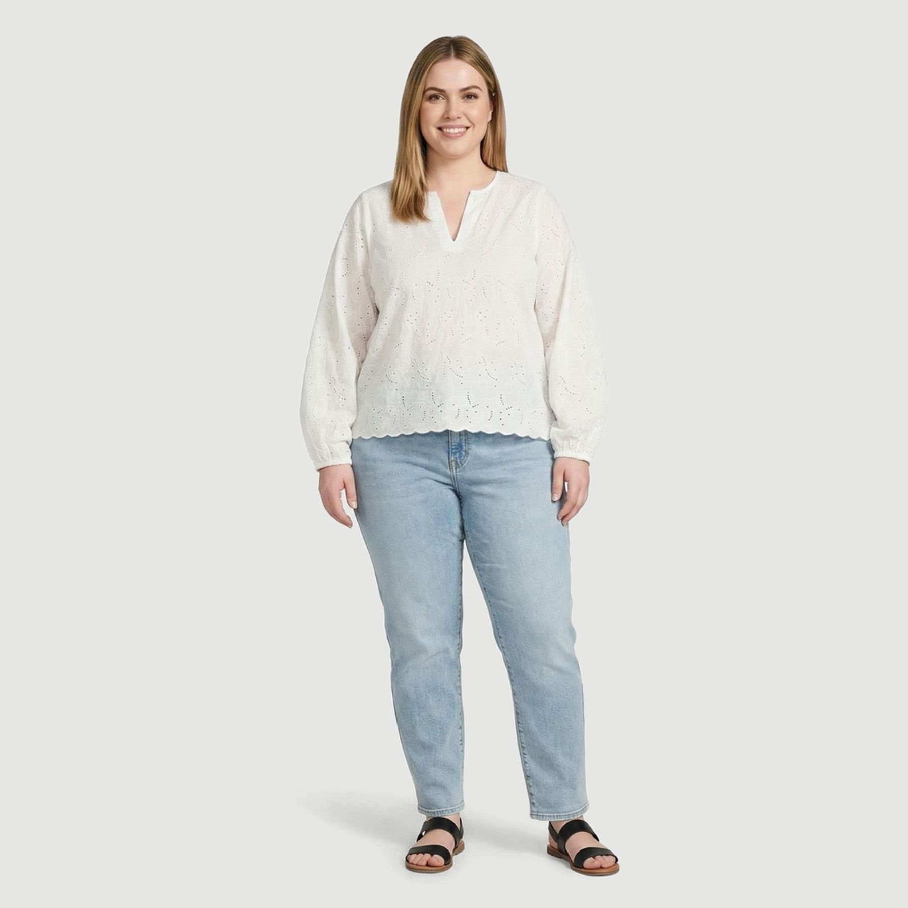 Economia de R$ 14,00A blusa plus size Viva Plus é confeccionada em 100% algodão com laise bordada vazada, trazendo um visual delicado e versátil. O decote em V com abertura frontal valoriza o colo, enquanto as mangas longas com punhos em elástico garantem ajuste confortável. Na cor bege e com barra de acabamento ondulado, combina facilmente com jeans, saias e peças de alfaiataria. Itens inclusos: 01 blusa.