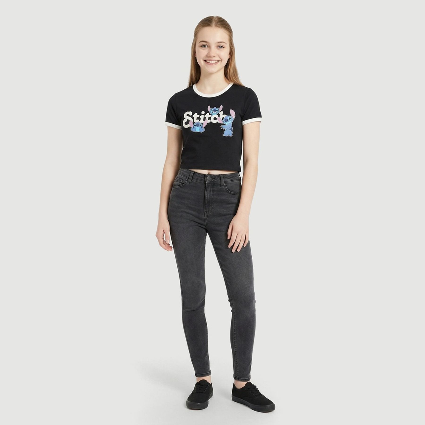Economia de R$ 4,00Blusa feminina Disney licenciada Lilo & Stitch, confeccionada em malha 100% algodão. A modelagem cropped com manga curta e gola redonda tem acabamento contrastante branco na gola e nas barras das mangas, destacando a peça na cor preta.