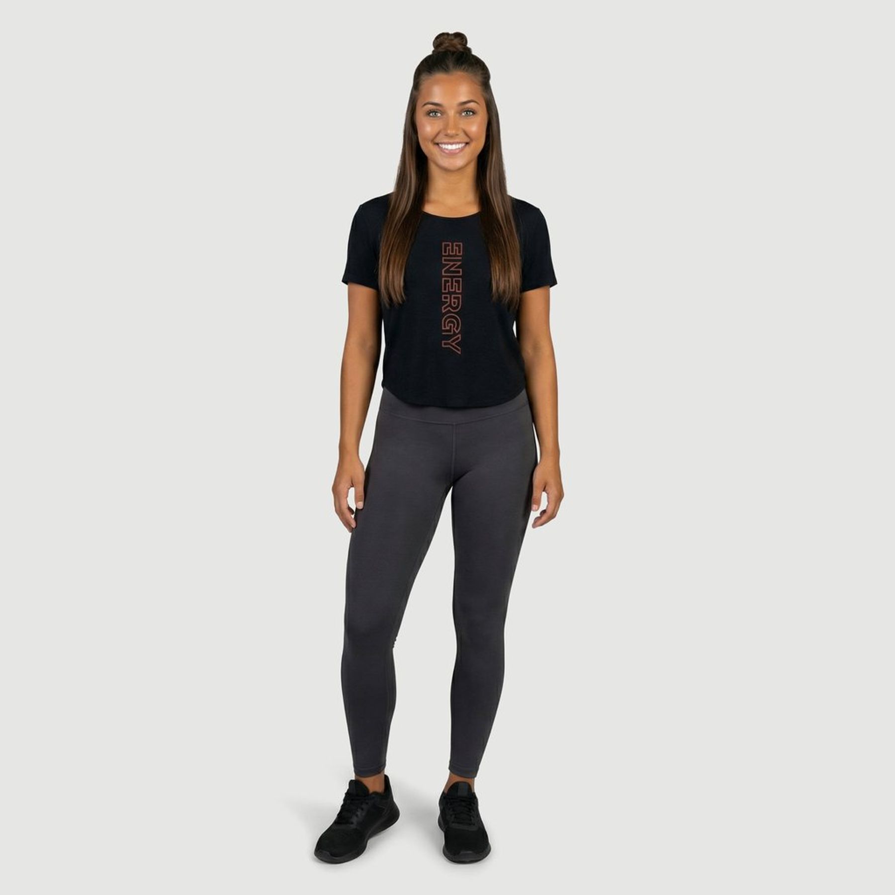 O destaque é a estampa frontal tipográfica com a palavra “ENERGY” em escrita vertical centralizada, em cor contrastante. Conta com gola redonda, manga curta e modelagem alongada, combinando bem com jeans, shorts e leggings.