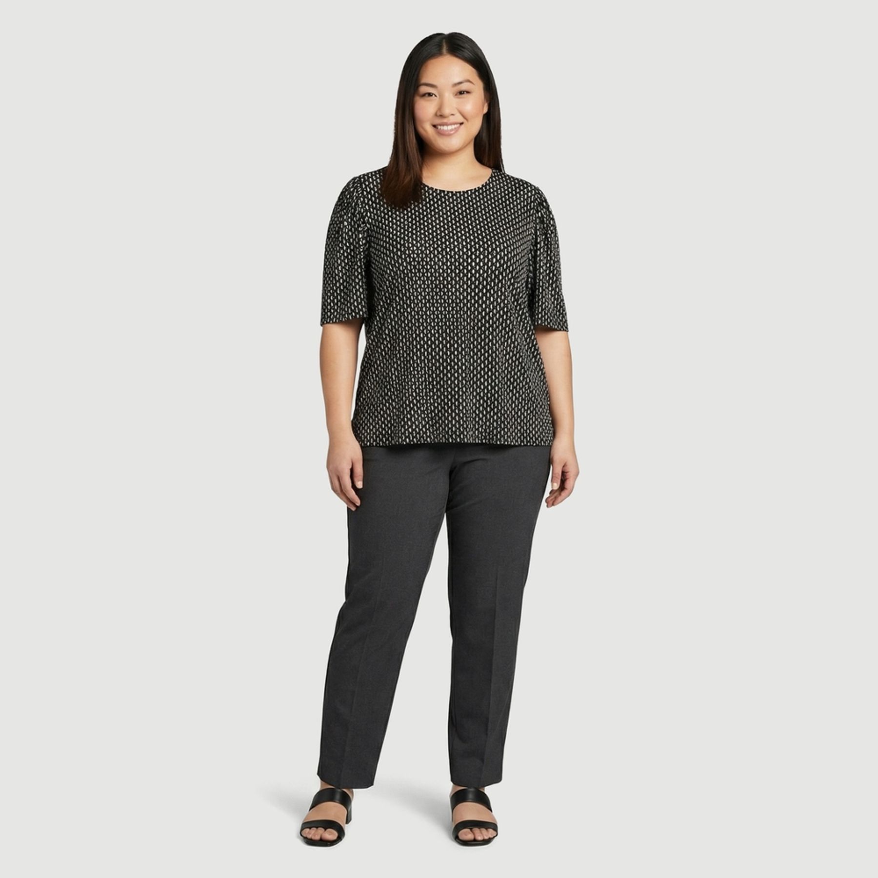 A estampa geométrica miúda em preto e branco (all over), com formas tipo losangos/ovais, combina bem com calças, saias e shorts lisos, criando produções versáteis.
