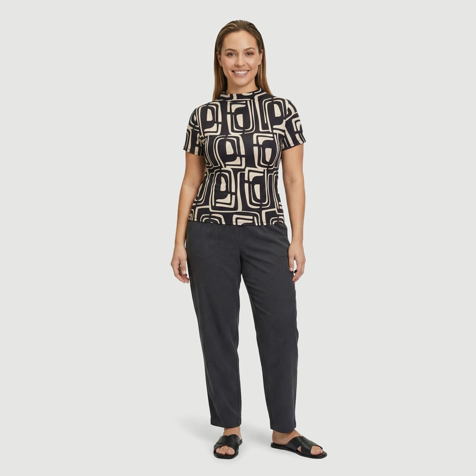 A peça tem estampa geométrica maxi em alto contraste, com formas retangulares arredondadas repetidas por toda a blusa, em preto e branco. Combina bem com jeans e peças neutras para um visual urbano.