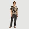 O destaque fica para a estampa abstrata maxi em preto sobre fundo bege, que traz um visual moderno e versátil. A manga curta e a gola redonda com acabamento retilíneo canelado listrado em preto e bege completam a peça com um detalhe diferenciado.