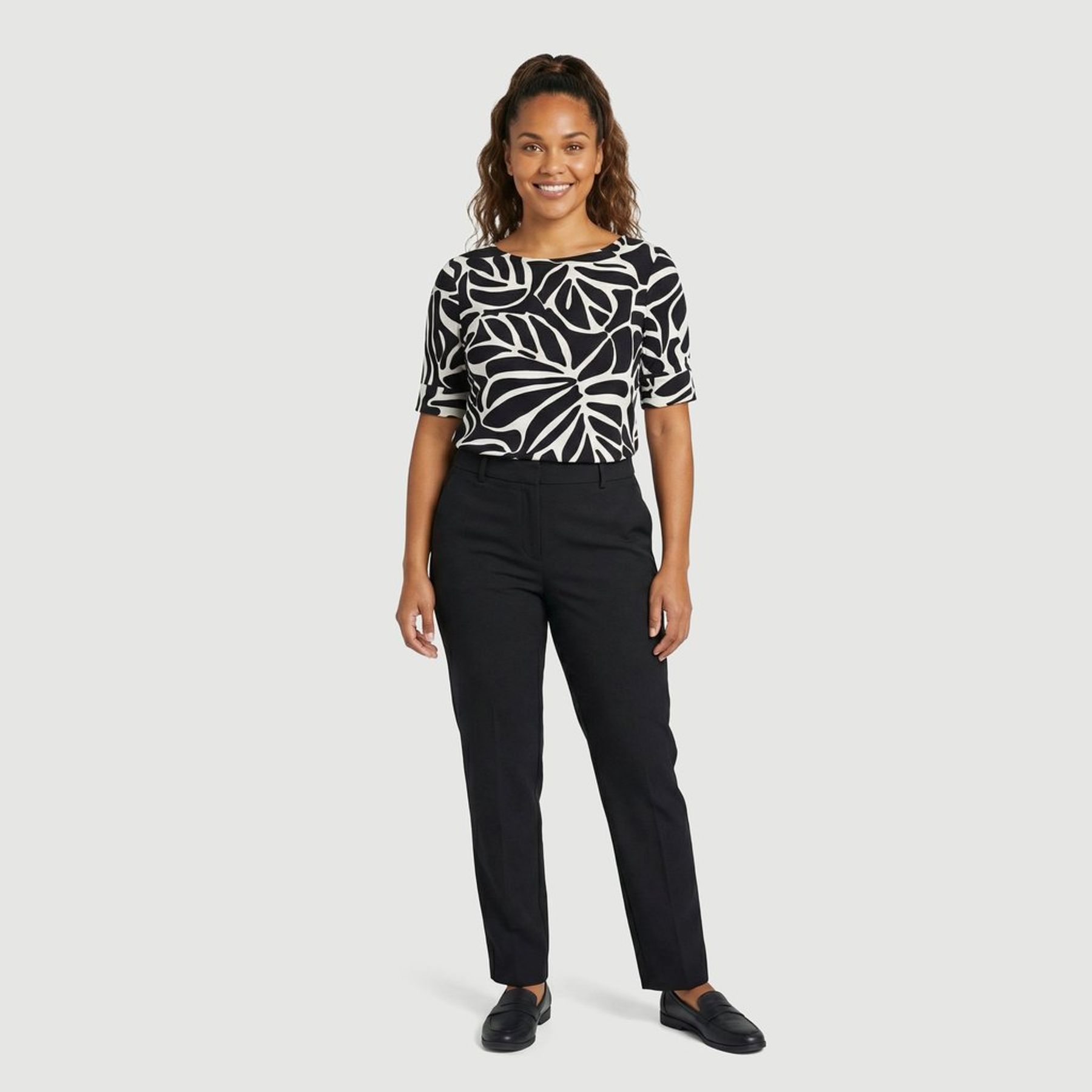 A estampa maxi de folhagens em preto e branco, em padrão corrido (all over), adiciona destaque ao visual. Com gola redonda e modelagem reta, combina facilmente com jeans, shorts e saias.