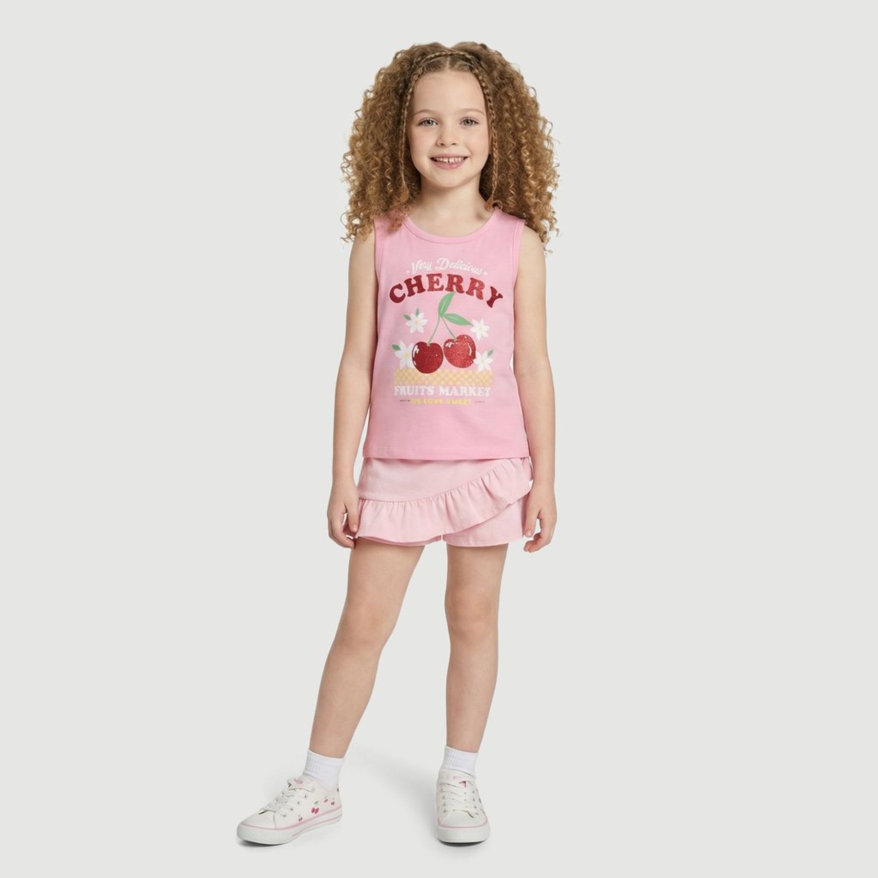 Economia de R$ 2,00A blusa sem manga infantil Yeapp é confeccionada em malha 100% algodão, com toque macio e boa respirabilidade para a rotina. Em tom rosa, traz estampa frontal com cerejas, flores e frases em inglês (“Very Delicious”, “CHERRY”, “FRUITS MARKET”), criando um visual divertido e charmoso.