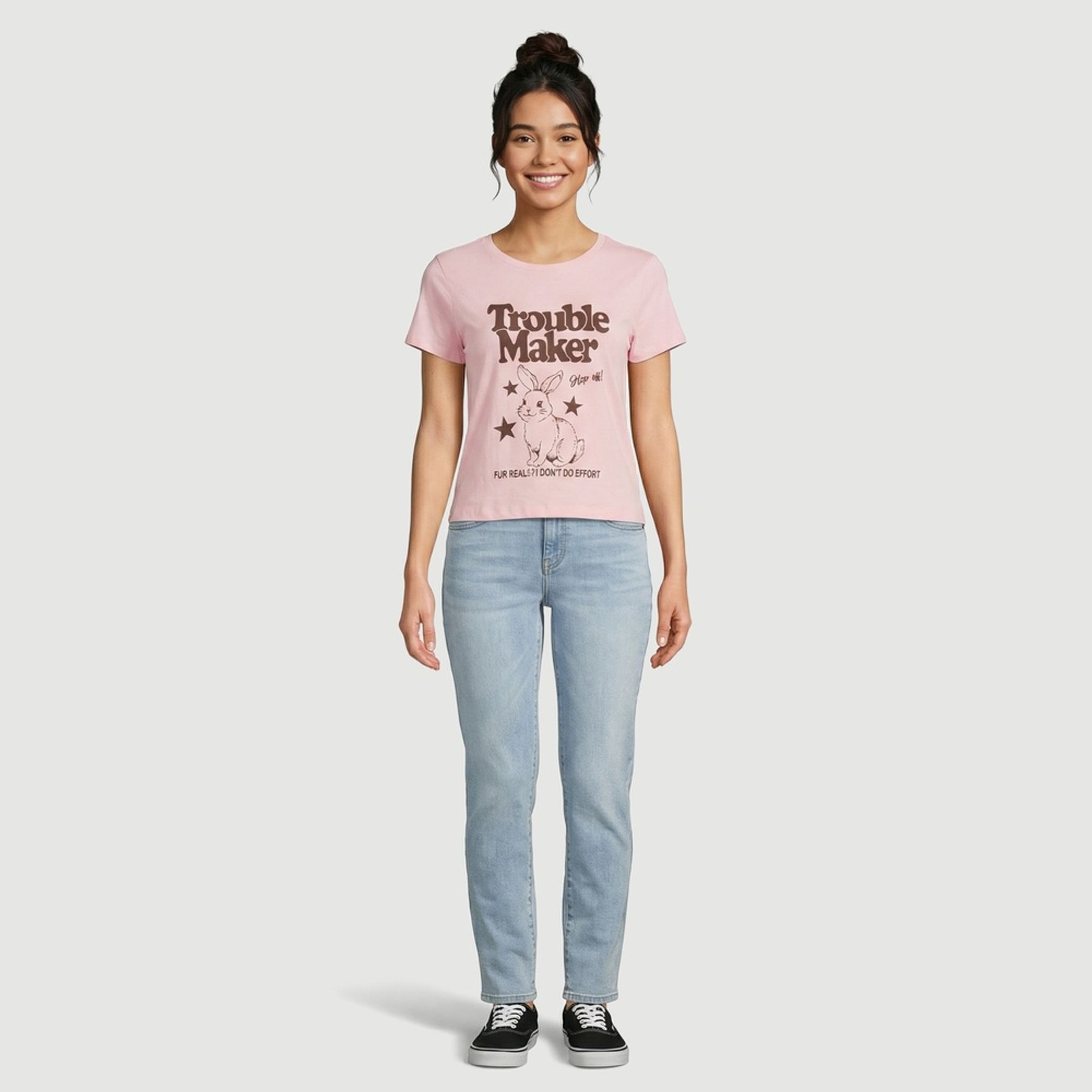 Economia de R$ 3,00A blusa feminina Love Trend é confeccionada em malha 100% algodão, com toque suave e caimento confortável. O modelo possui manga curta, gola redonda e barra simples. A estampa frontal centralizada em preto traz frases com estrelas e ilustração de coelho, criando contraste com o rosa da peça.