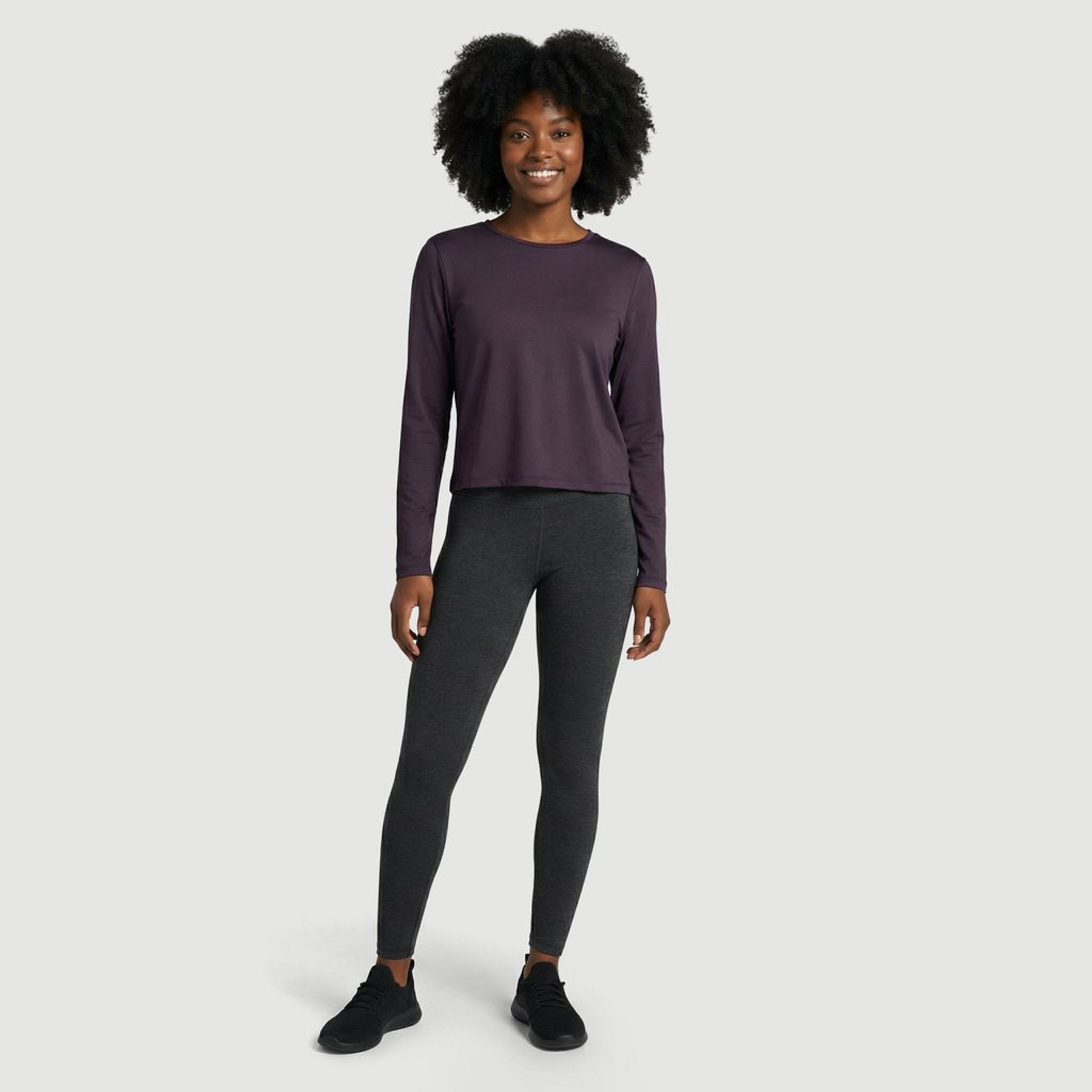 O design liso em roxo uniforme traz visual minimalista e fácil de combinar. A malha sintética de composição mista com predominância de poliéster tem leve brilho e caimento ajustado, enquanto a gola redonda, as costuras aparentes nos ombros e a barra simples finalizam o acabamento.