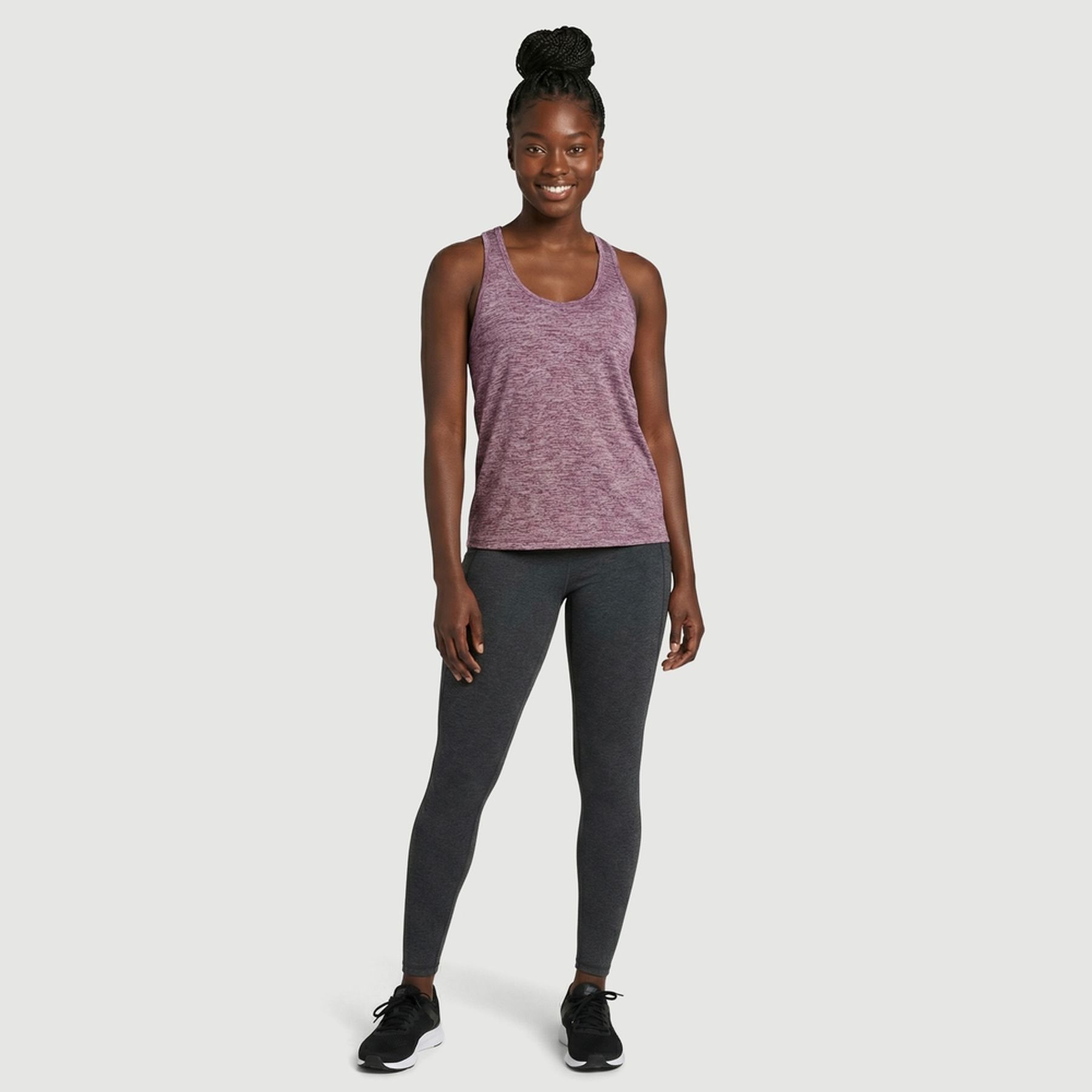 Em roxo mesclado, tem decote redondo, cavas amplas e alças largas, garantindo liberdade de movimentos no uso diário e em treinos leves. A barra levemente arredondada e o logo discreto na parte frontal superior completam o design.