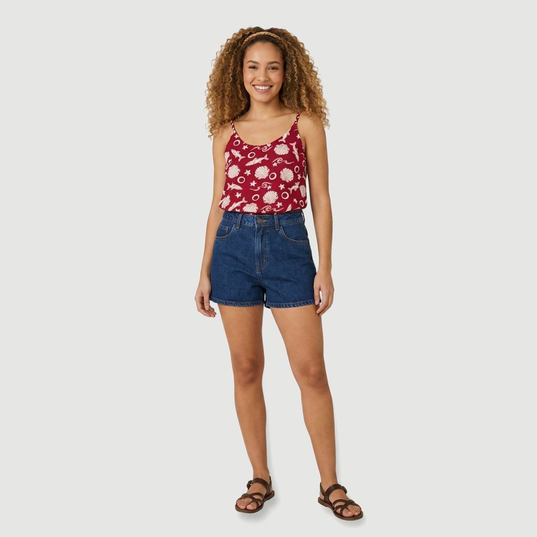 O visual se destaca pela estampa temática do fundo do mar em branco sobre fundo vermelho. O modelo sem manga conta com alças finas trançadas e decote reto levemente arredondado, combinando bem com shorts, saias e calças leves.