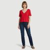 Na cor vermelha e sem estampa, o modelo tem manga curta e decote V. A gola retilínea com faixa contrastante bege adiciona um detalhe discreto ao visual.