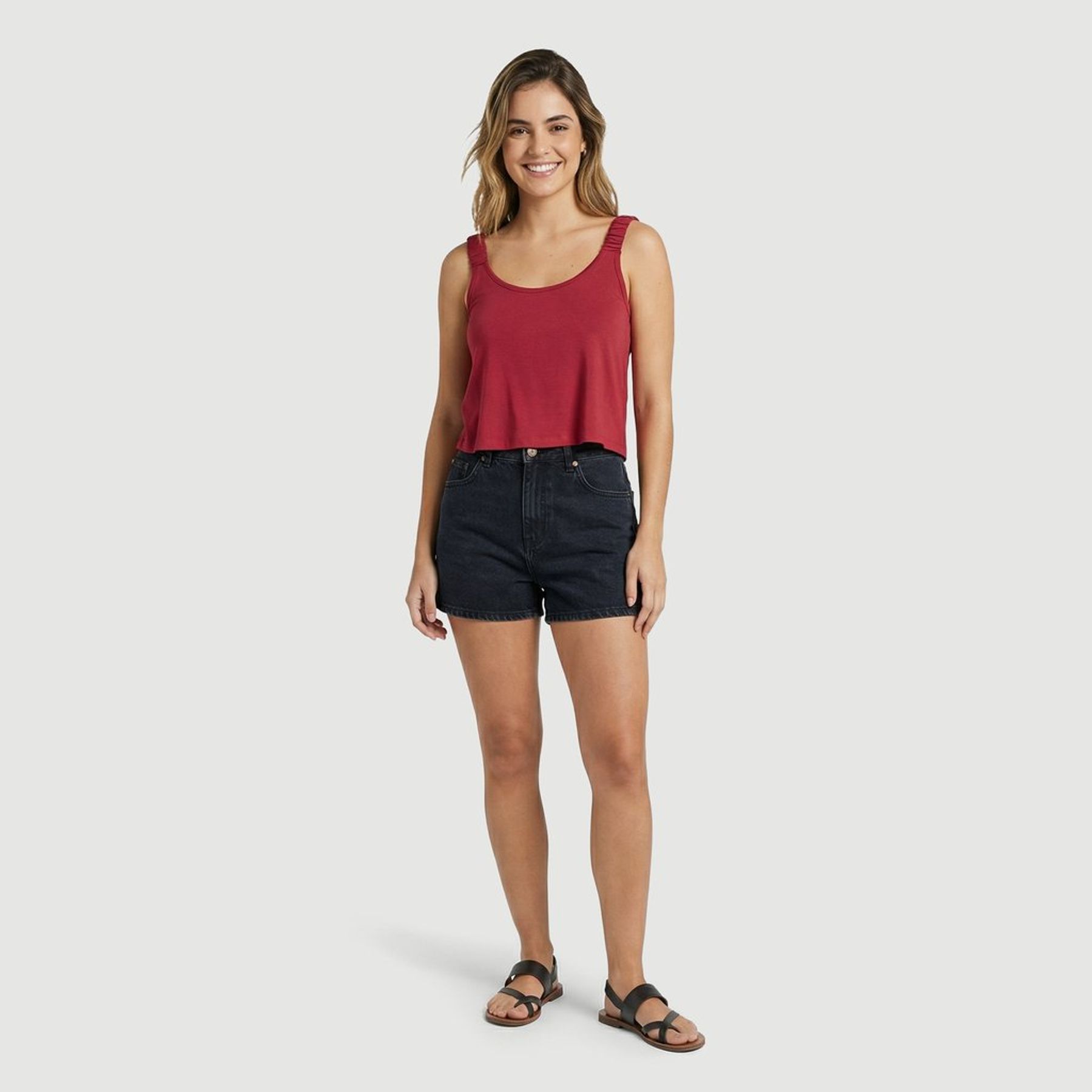 O vermelho liso facilita combinações, enquanto o decote redondo e o franzido nos ombros (alças largas) trazem um detalhe delicado ao design. Uma peça versátil para usar com jeans, saias ou shorts, do trabalho aos momentos de lazer.