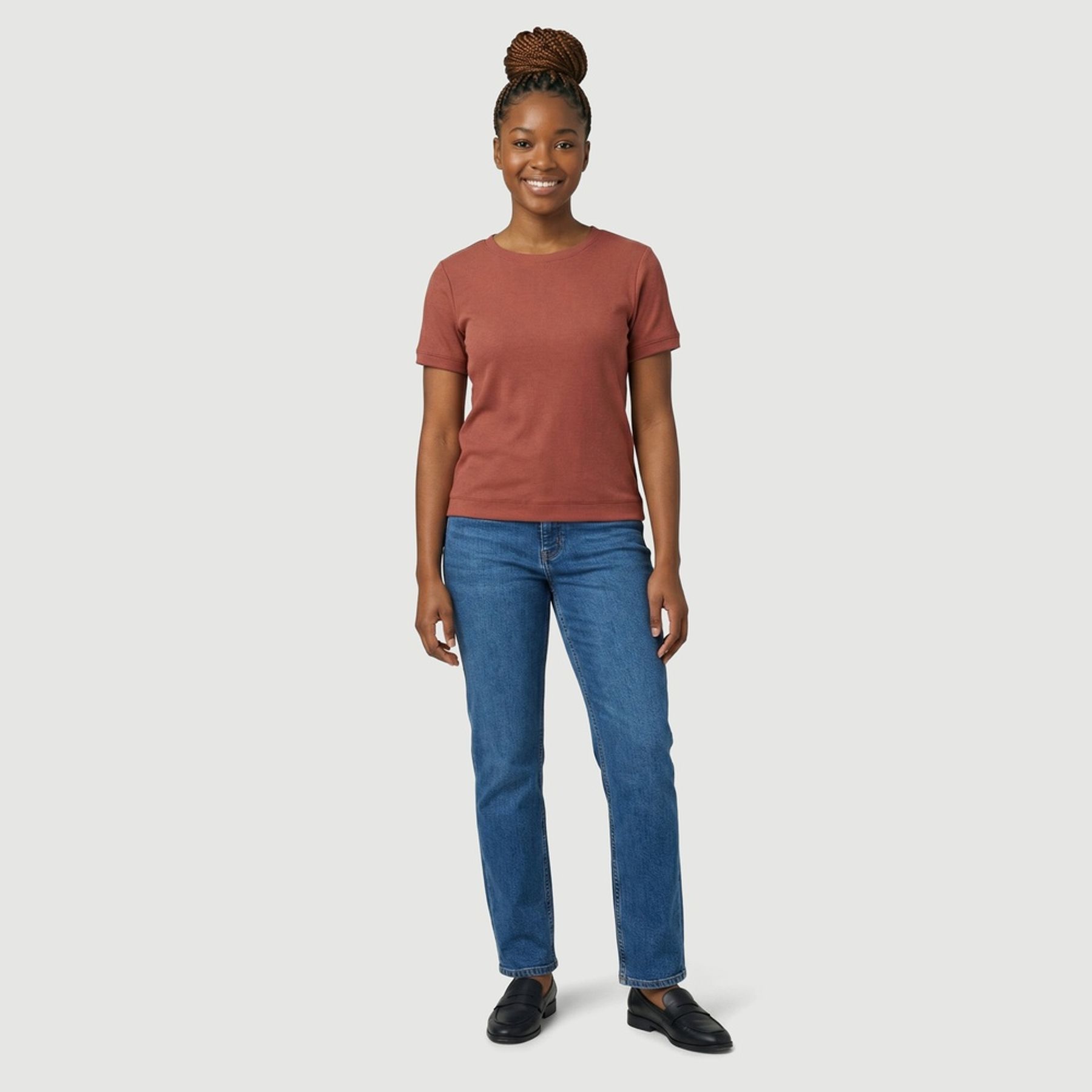 Confeccionada em malha canelada com predominância de poliéster, tem toque confortável e textura discreta. O modelo conta com manga curta, decote redondo, barra com bainha e acabamento com costura aparente, trazendo um detalhe sutil ao design liso.