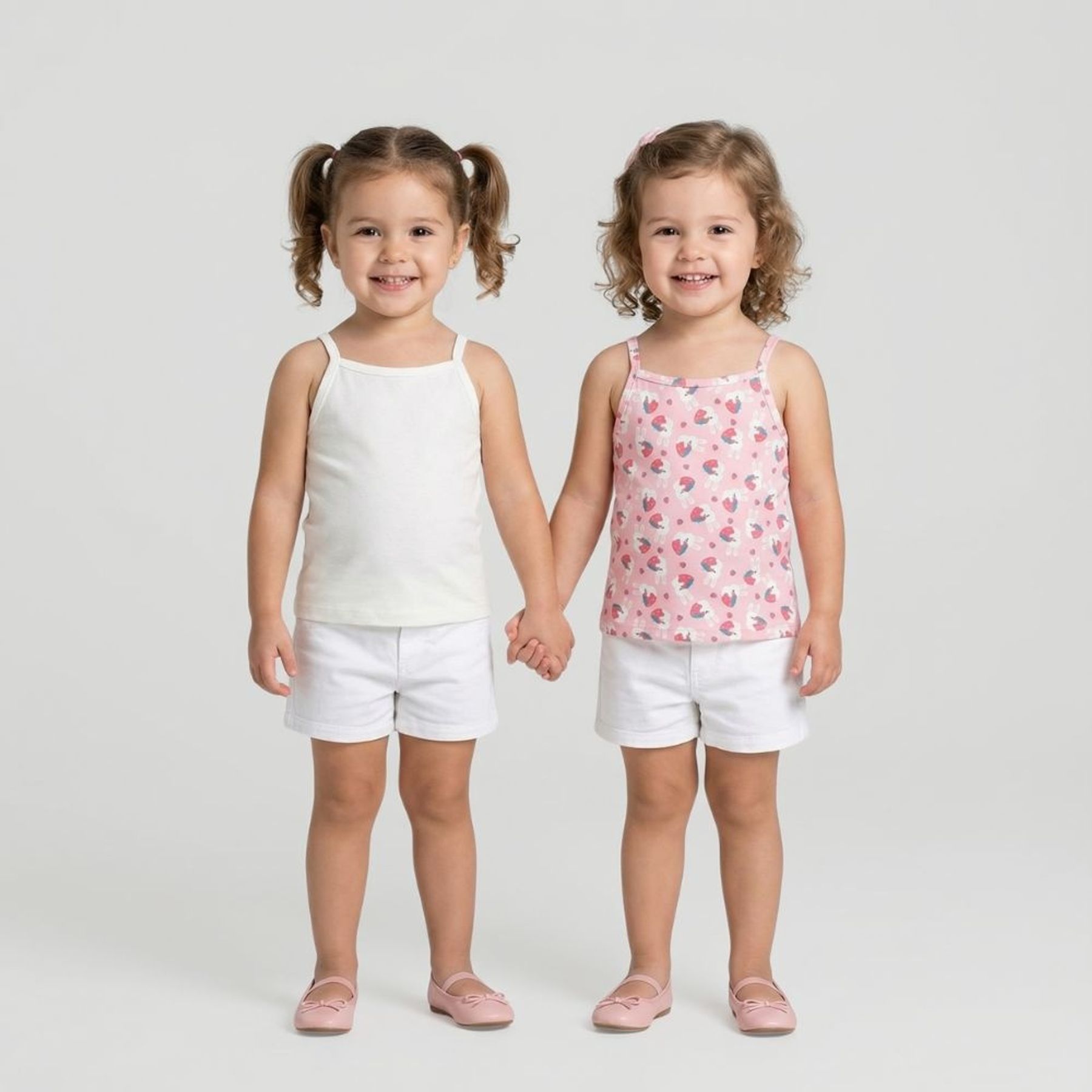 A blusa sem manga 2 em 1 é ideal para compor looks delicados e práticos para meninas. Confeccionada em malha com predominância de algodão, oferece toque macio e conforto no uso. O conjunto traz duas regatas com alças finas e decote reto: uma lisa em tom creme e outra rosa com estampa de coelhinhos e morangos, perfeita para variar as combinações.