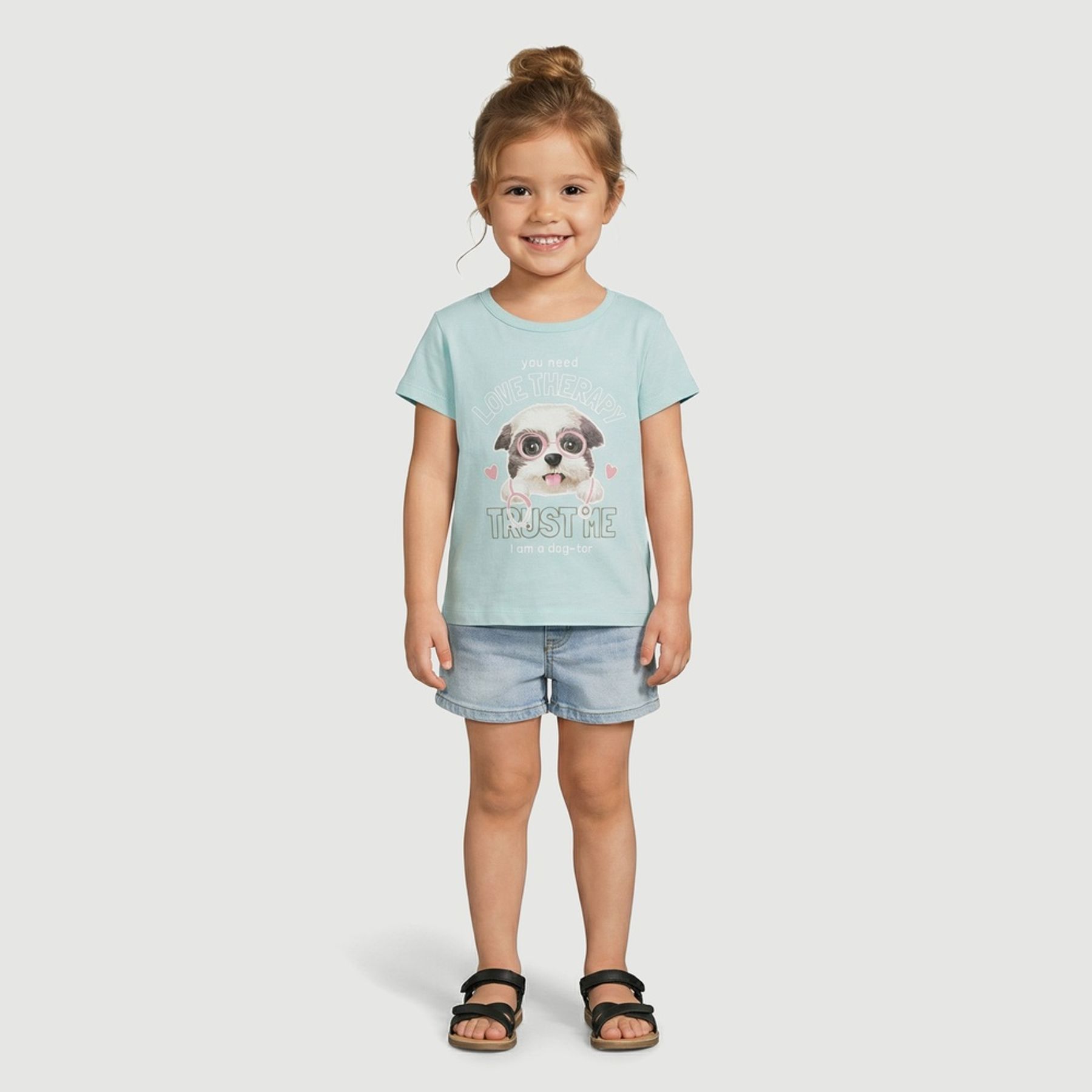 A estampa frontal centralizada traz um cachorrinho com óculos e estetoscópio, além de corações e lettering, criando um visual divertido e fácil de combinar com shorts, saias e calças.