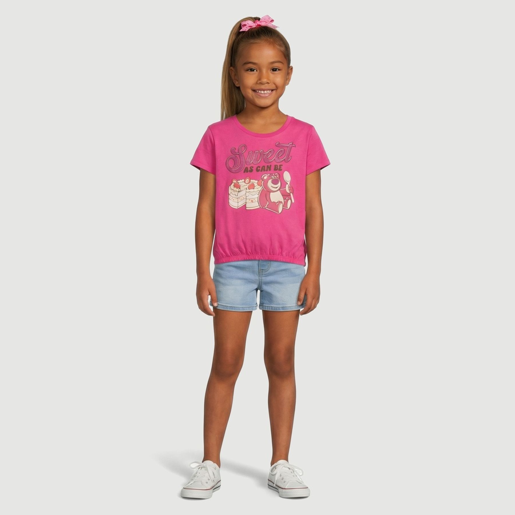 O modelo tem manga curta, gola redonda e estampa frontal centralizada do Lotso (Toy Story) com a frase "Sweet as can be". A barra com elástico franzido melhora o ajuste e cria efeito blusado.