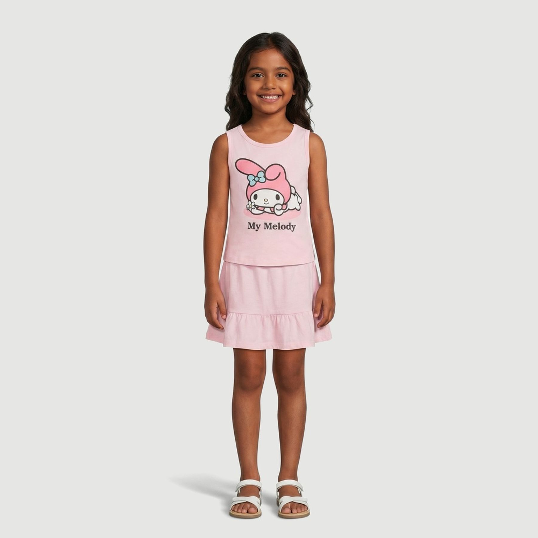 A estampa frontal centralizada da My Melody com o nome em destaque traz um visual delicado em tom rosa, fácil de combinar com shorts, saias e calças. Produto licenciado Hello Kitty.