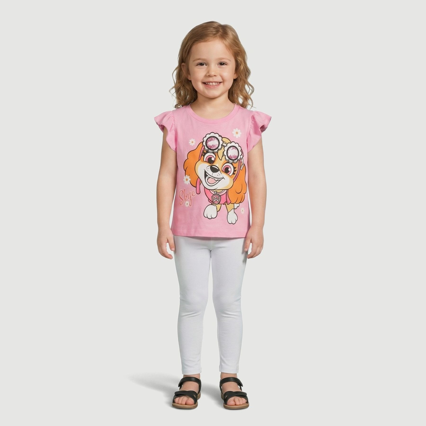 O destaque fica por conta da estampa frontal grande da Skye com flores e o nome “Skye”. A peça tem gola redonda, mangas curtas com babado e detalhe com brilho no aplique dos óculos, trazendo um acabamento especial.