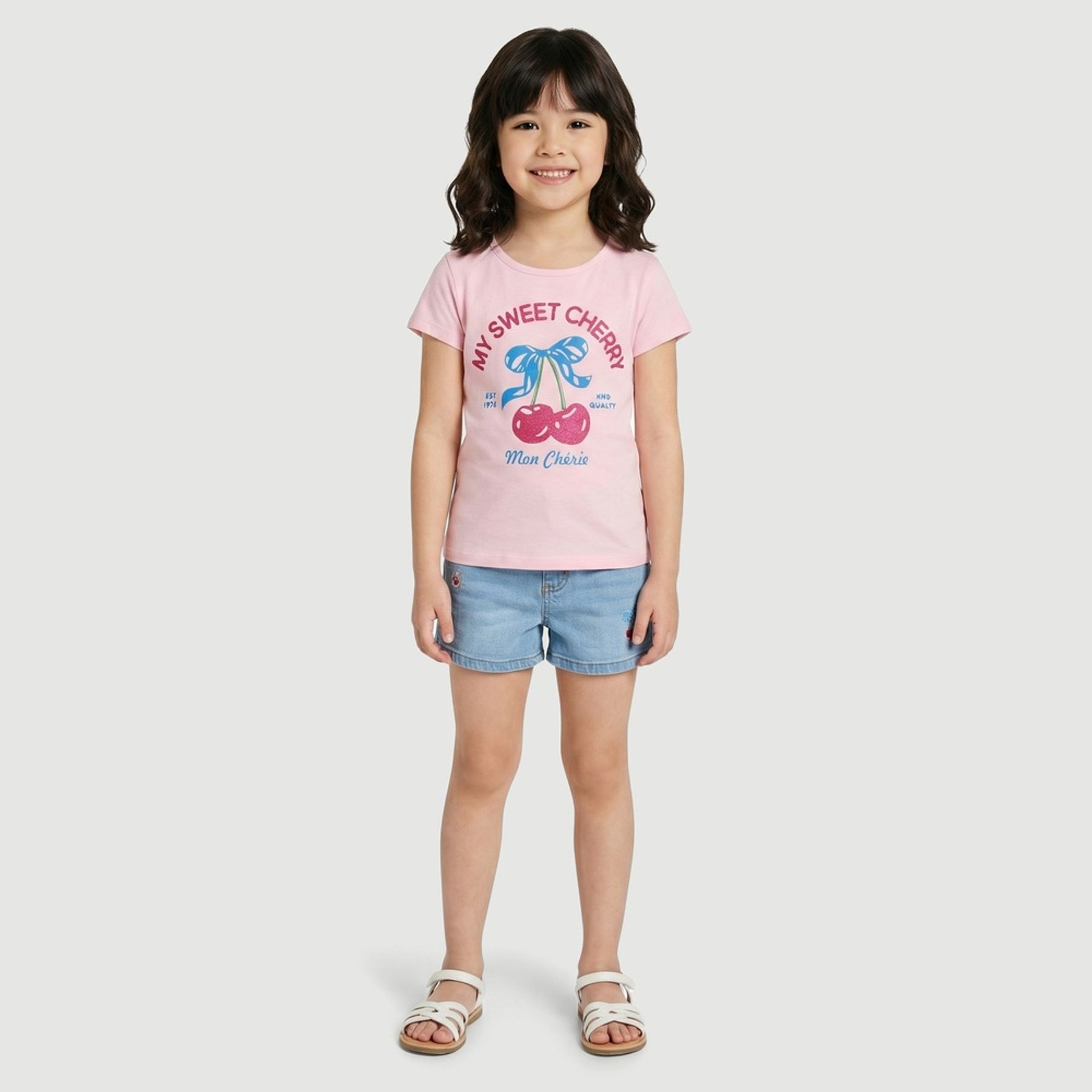 Possui gola redonda, manga curta e barra simples. A estampa frontal traz a frase “MY SWEET CHERRY” com cerejas e laço, combinando facilmente com shorts, saias ou calças.