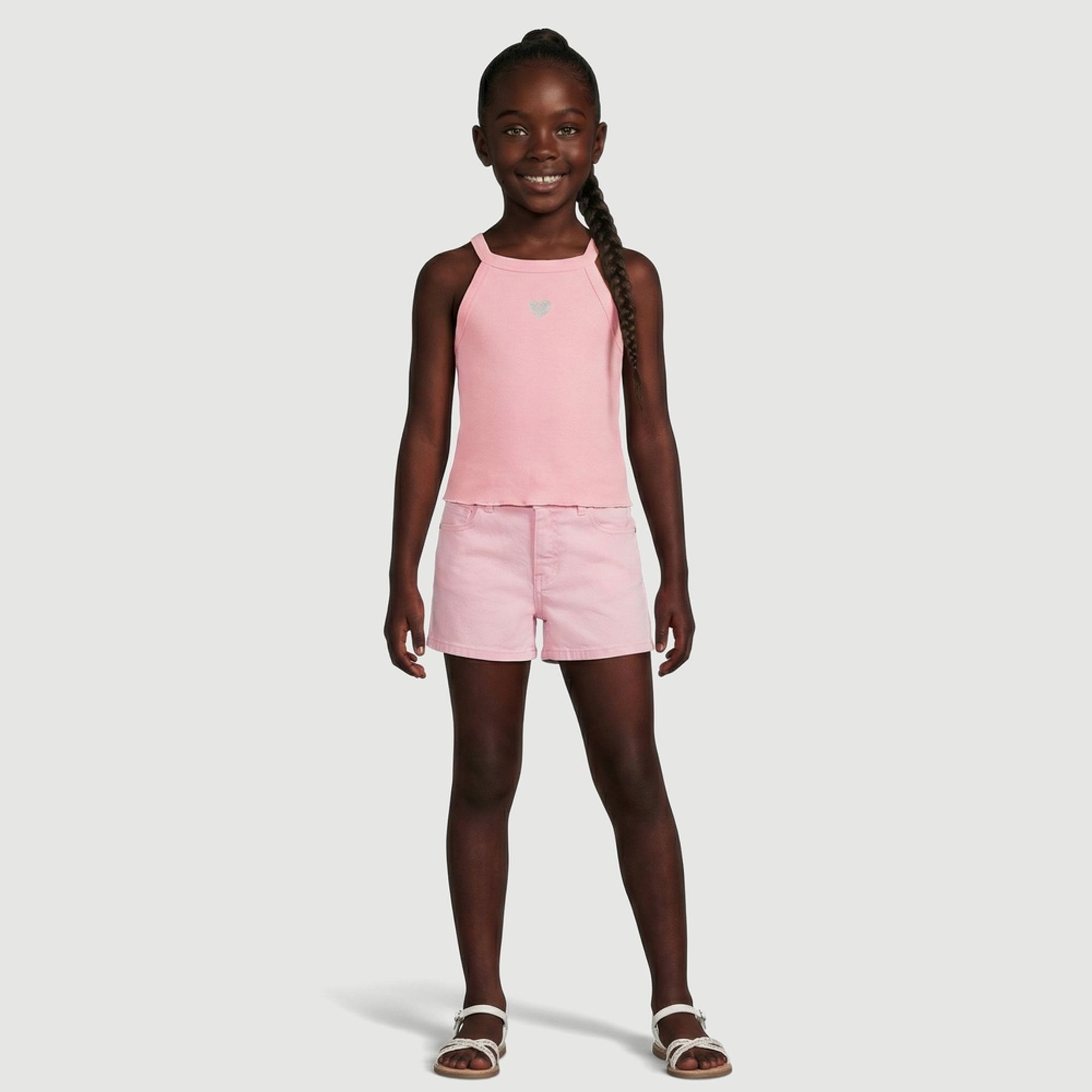 Economia de R$ 3,00A blusa regata infantil Yeapp é uma opção delicada e versátil para combinar em diferentes produções. Confeccionada em malha canelada (ribana) rosa, tem alças largas, decote quadrado e cavas amplas, oferecendo bom caimento e liberdade de movimento. O destaque fica para a aplicação frontal de coração prateado e a barra com acabamento ondulado, que adicionam um toque leve ao visual.