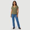 A peça é lisa na cor verde militar, tem manga curta e decote V em ribana, além de modelagem levemente acinturada e barra com costura aparente. Fácil de combinar com jeans, saias ou shorts, é um item essencial para o guarda-roupa.